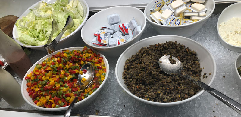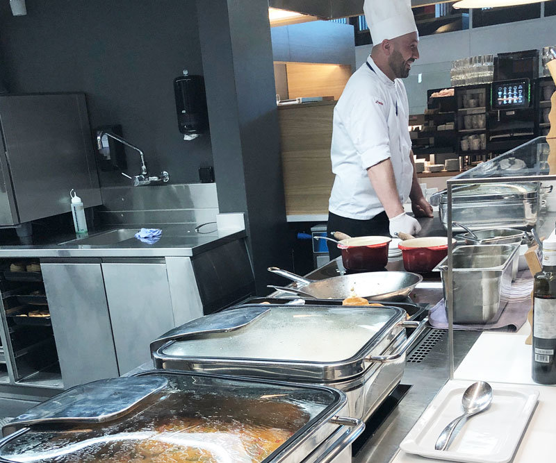 On the dining floor, there is a variety of food and drinks including the option to have a chef-prepared meal. There is also range of salads, bread, fresh fruit, chocolate cake, and ice cream to help yourself to. And a self-serve bar has an extensive range of beer wine and spirits available.