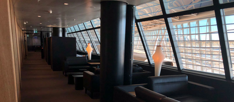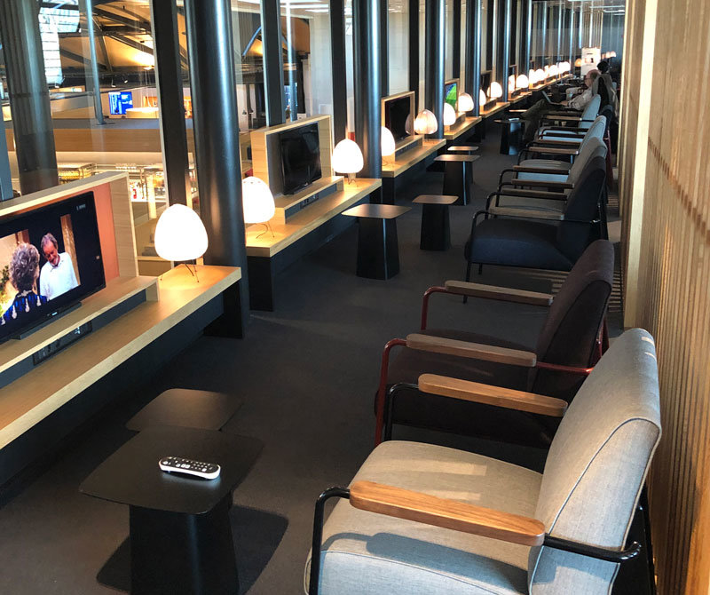 Above the dining area is the quiet area for travellers who wanted to relax before their next flight. This area is separated into two, one side with multiple televisions and lounge chairs, so you can catch up on the latest TV or News. The other side is filled with couches looking out over the terminal below, perfect for reading your book or just relaxing.
