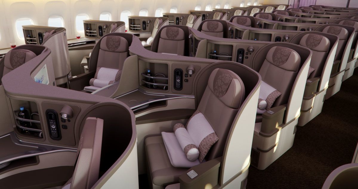 The China Eastern 777-300ER business class cabin features a 1-2-1 reverse herringbone layout with 190 cm lie flat beds.