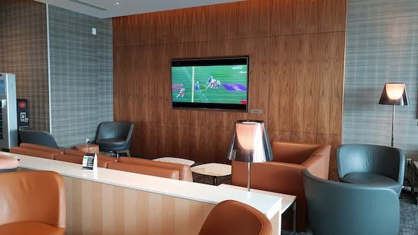 TV's showing sports and news are placed around the lounge. As well magazine racks stocked with a variety of magazines and newspapers.