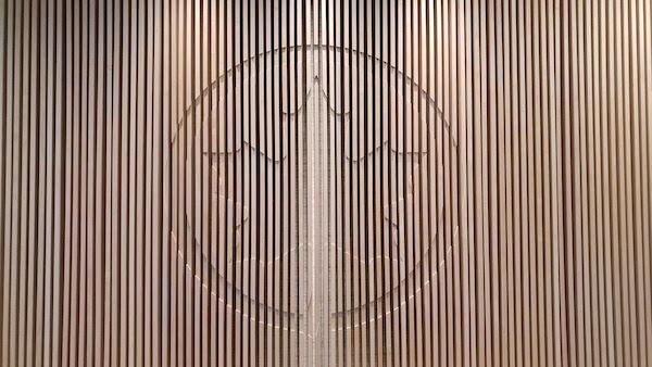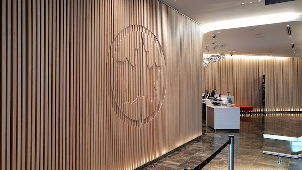 The entrance to the lounge is adorned with a large wooden Maple Leaf Insignia. Inside the natural materials continue with plenty of woof accents, leather furniture and soft lighting, as well as artwork depicting Canadian Landscapes. A range of seating options are available with plenty of lounge chairs.