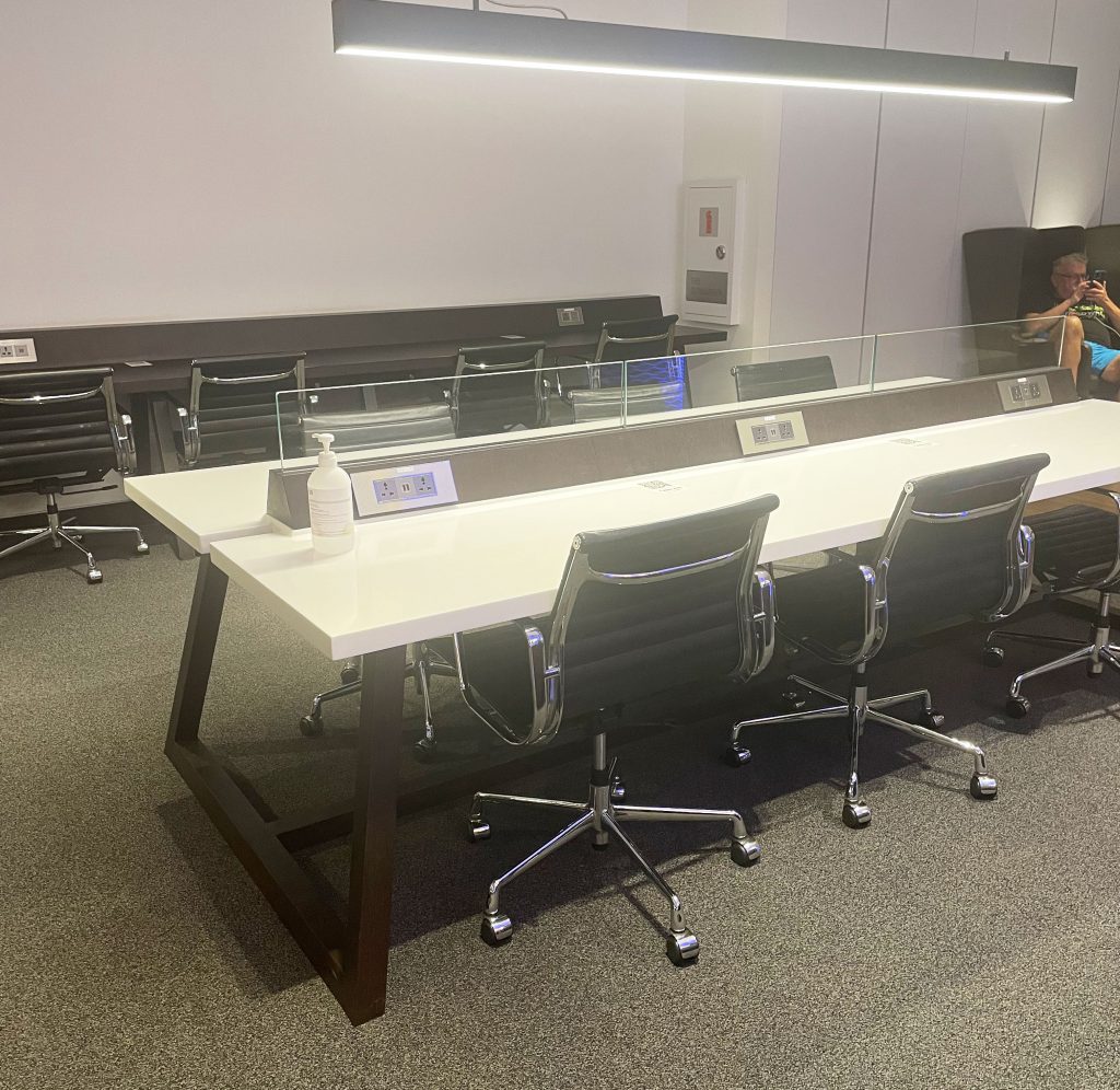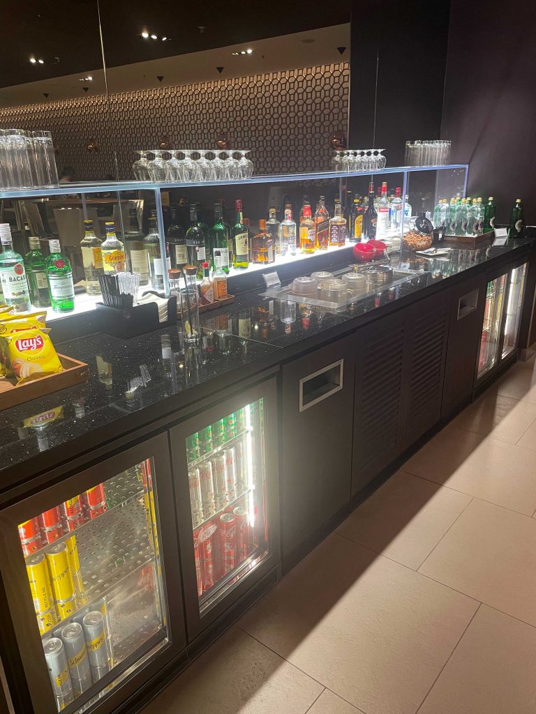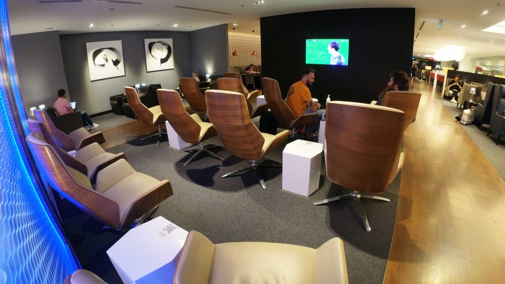 As you enter the lounge it opens up to a long walkway past a variety of seating options including leather arm chairs, couches and high bar tables, all with floor to ceiling windows on the left over looking the inside of the terminal. All arm chairs and couches also had a small table nearby with a QR Code for ordering food and drinks to your seat and charging ports.