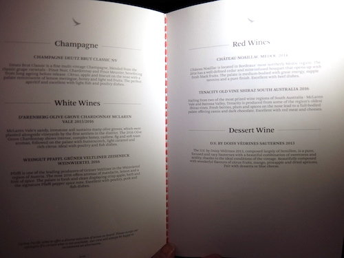 After settling into our seats, we were presented with our amenity kits. The bags were very neat and inside was a bevy of products including Jurlique skin care (I found the face mist particularly nice to keep hydrated during the flight), an eye mask, ear plugs and socks, plus a teeth cleaning kit with the addition of a small tup of mouth wash.