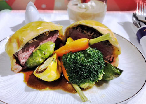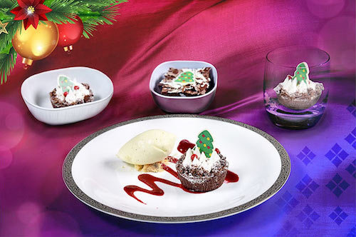 Passengers in First Class and Business Class can enjoy roasted turkey breast with apricot stuffing, roast potatoes, and brussels sprouts with turkey bacon and cranberry sauce. Festive sweets including a chocolate Yule Log garnished with meringue drops, Gingerbread, and a Chocolate mint snow dome will be served for dessert.