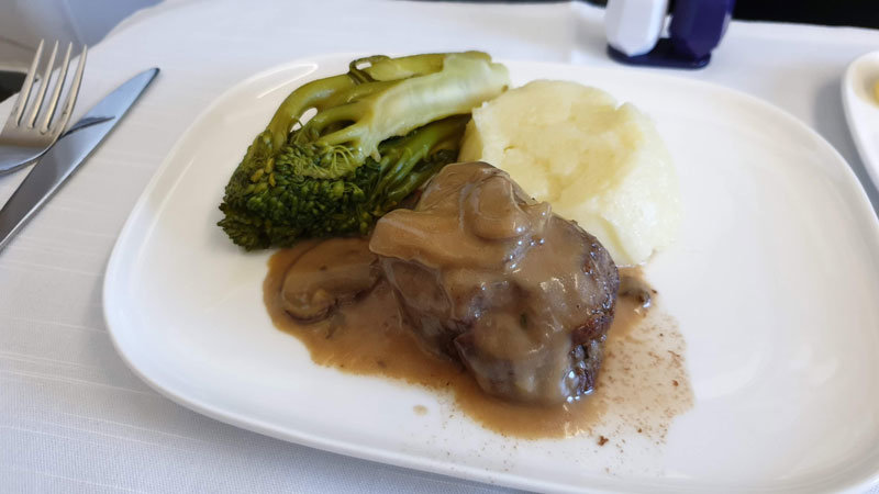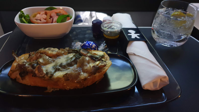 Midway through the flight, we had the option of a light snack, with the choice between a mushroom bruschetta or a Charcuterie and Cheese Plate. We chose the mushroom bruschetta which was served with a green salad and chocolate. It was a good-sized meal and an excellent way to break up the flight.