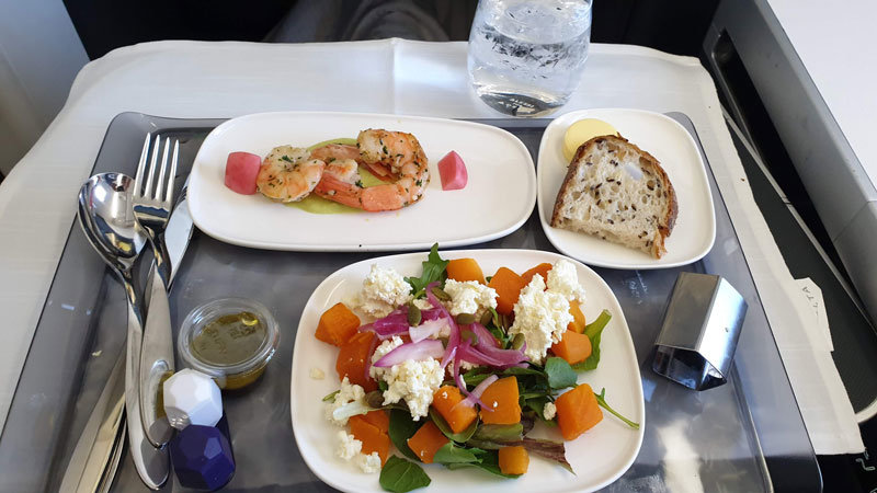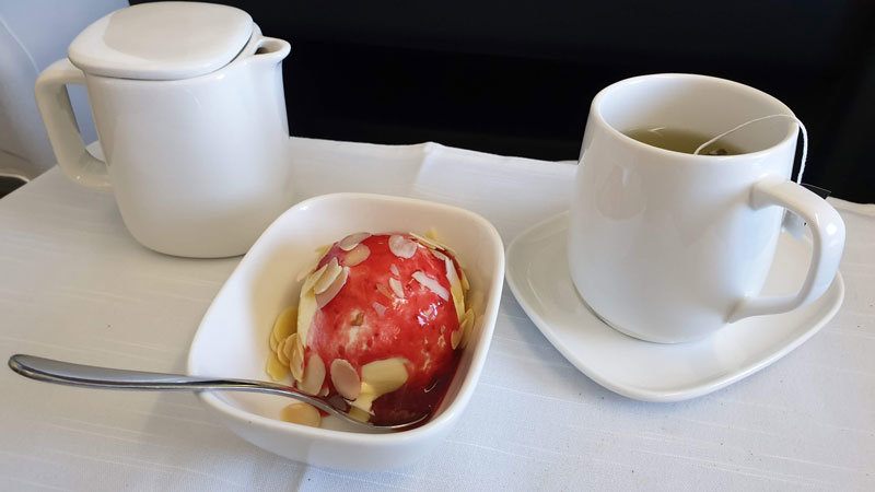 The Delta inflight menu included an express style breakfast with your order for the entire flight being taken before the plane even pushed back. The food offered was a bit pedestrian with all of the options including various grilled meats, but otherwise, it was a pleasant menu. To start we had the Herb Marinated Prawns, with a green pumpkin salad and pomegranate dressing. For the main course, we decided to order the Beef tenderloin with potato puree and broccolini, which was a bit overcook as is often the case but still tender and delicious. After the main meal, we were able to choose from a dessert cart our choice of ice cream with an array of toppings or a cheese course including King Island Brie and Yarra Valley Feta. Dessert was served a good 30 minutes after the main meal, on a night flight this would have been too long but as it was a day flight it was nice not to feel rushed through all of the meals.