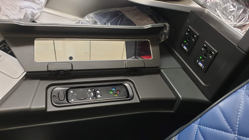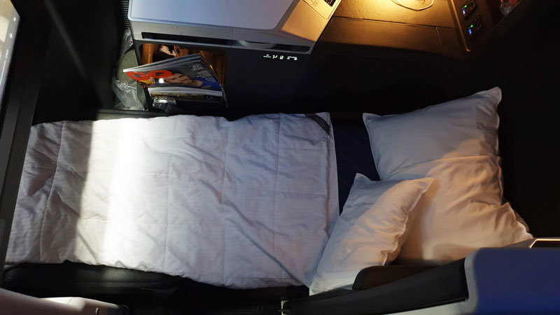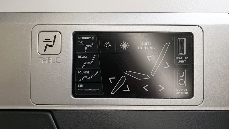 The Suite is well-appointed with great storage for shoes as well as ample space for headphones, amenities, water bottle and magazines. USB and AC charging ports are conveniently located next to both the seat and the storage compartment, making working or storing your device while charging possible. The seat controls were in easy reach with options to not only convert the seat into a bed but to adjust the lumbar and leg supports. Once in the bed position, there is a smaller control panel that can be used without sitting up. On these panels, there is the option to adjust the lighting and activate a ‘do not disturb’ feature. Once the seat is converted to a bed it was very comfortable with a plush blanket and soft pillow. Unfortunately, the sliding door of our suite was broken and wouldn’t close to make the suite fully enclosed for maximum privacy. The handset was also broken so I couldn't use the overhead light or call flight attendants, these were minor annoyances but shame on such a new product. Perhaps they broke on the flight over and will be fixed when back in the US.