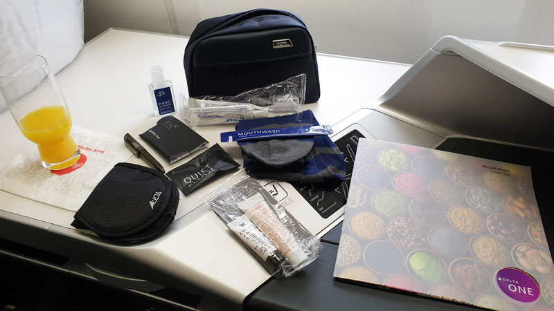 After getting comfortable in the suite we were offered the usual choice of orange juice, water or Champagne as a welcome drink to enjoy while we perused the inflight menu and amenity kit.