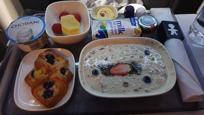 Breakfast was served an hour or so before landing, we opted for muesli, fresh fruit and a danish. Other options included a Potato and Cheddar Frittata, and Sourdough French Toast. The meal was a great start before a busy day.