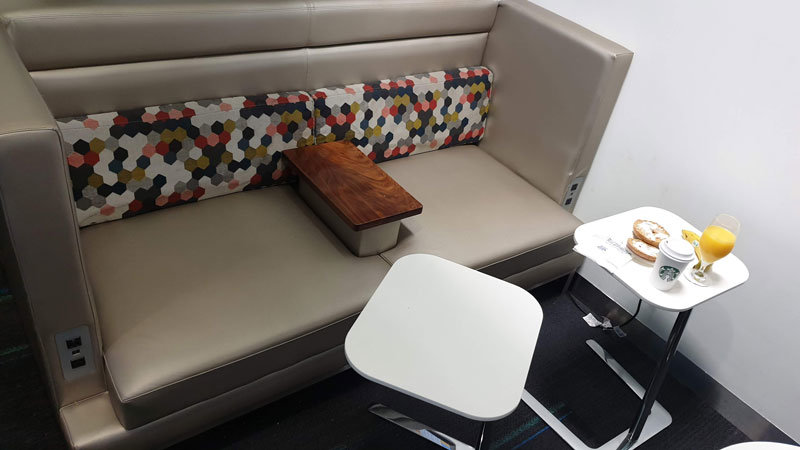 The lounge has a range of different seating options including a dining area and a lounge area, but it looked like it was really set up to allow patrons to continue working before their next flight with benches and lounge chairs seat up with power access to charge your device while you work.