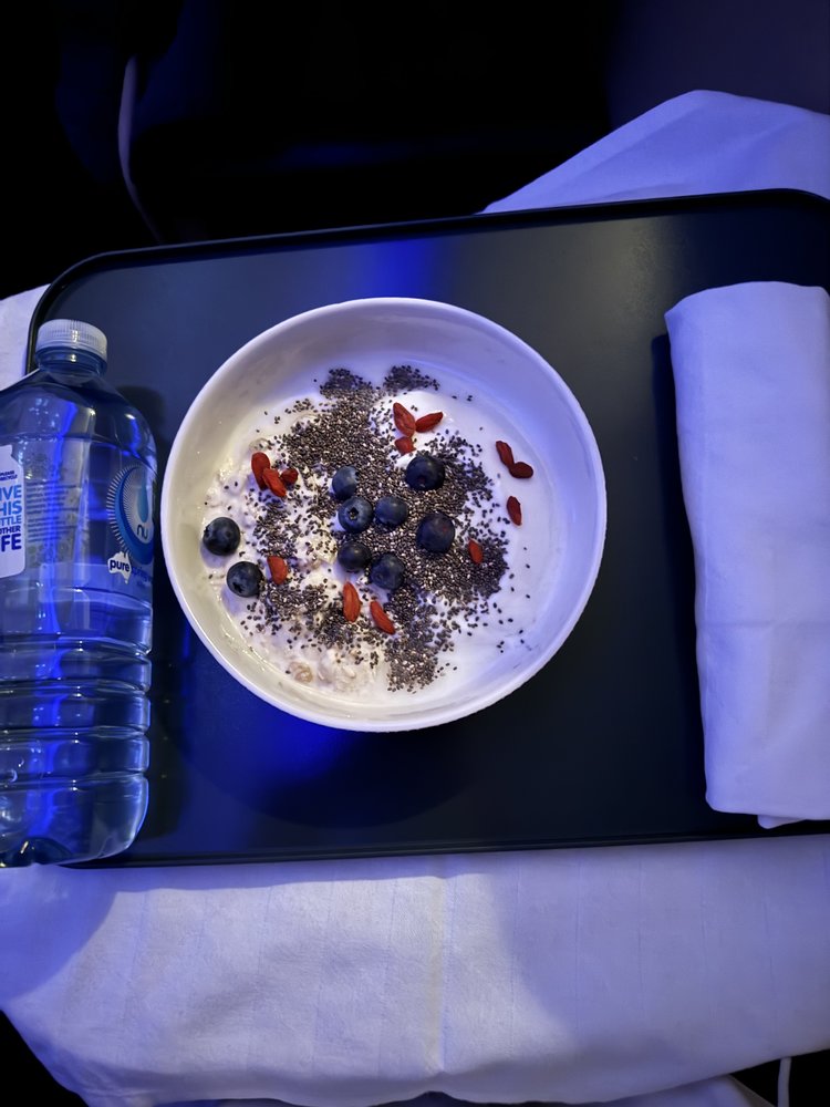 We skipped dessert due to being full from the lounge and the late dinner service. Breakfast included a yoghurt bowl that was standard but somewhat plain and tart without enough muesli.