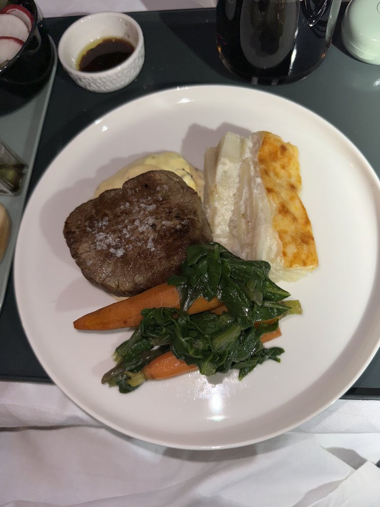 For the main course, we chose the beef tenderloin, which was surprisingly moist and well-cooked for aeroplane food. The accompanying potato gratin had a vinegary taste, which may be a matter of personal preference, but was average. However, the bernaise sauce was exceptional and steamed carrot and spinach sides bland but alright overall.