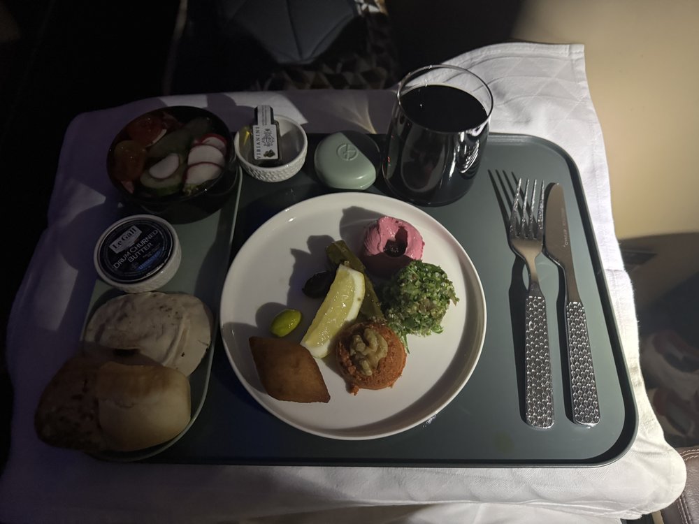 The inflight dining experience in Etihad 777-300ER Business Class had its highs and lows. We started with an Arabic mezze appetiser, which was delicious and well portioned. They had a variety of traditional Arabian delicacies which made it fun to taste and try different dishes.