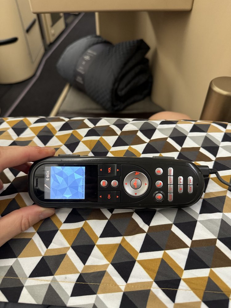The entire Business Class cabin is made up of 40 Stelia Solstys II seats, all with fully Flat Beds in a 1-2-1 cabin configuration. The layout felt more open, and our seat, 6H, offered both armrests and smaller, practical storage spots that could only fit odd-sized items.