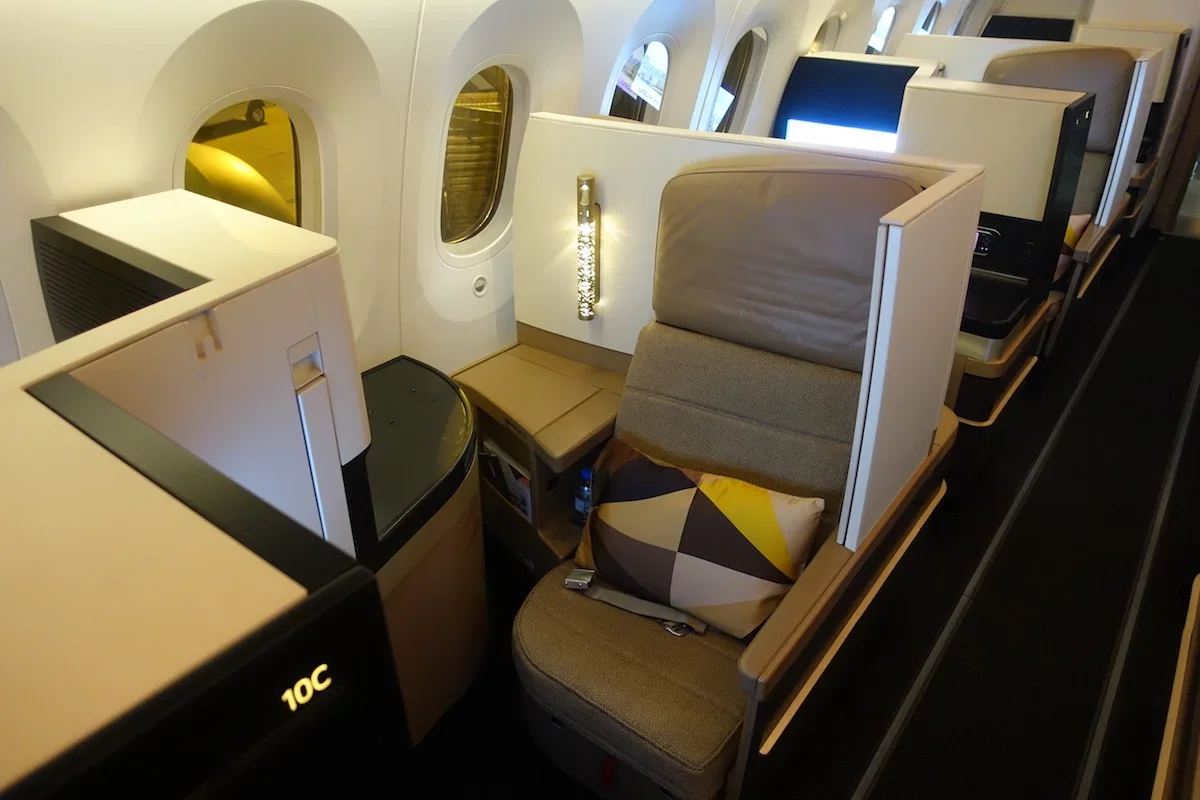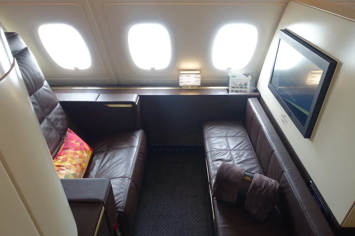 The A380 features 70 Business Class Studio’s and 9 First Class apartment suites in a 1-1 configuration with a wide leather lounge chair and an ottoman that converts into a fully flat bed.