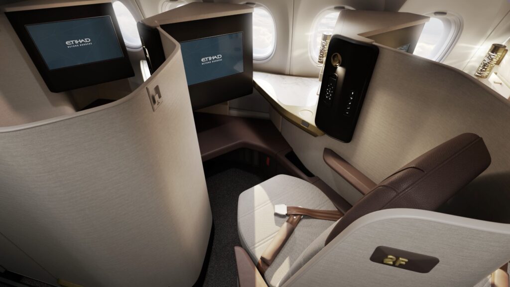 The highly anticipated aircraft (said to be the first of 30) introduces premium widebody comforts on short and medium-haul flights for the first time in Etihad’s history. The A321LR is the first single-aisle product in Etihad’s fleet to feature proper First-Class cabins and fully flat beds in Business Class. With a three-cabin layout, the aircraft hosts herringbone-style Business Class seats with direct aisle access for passengers.