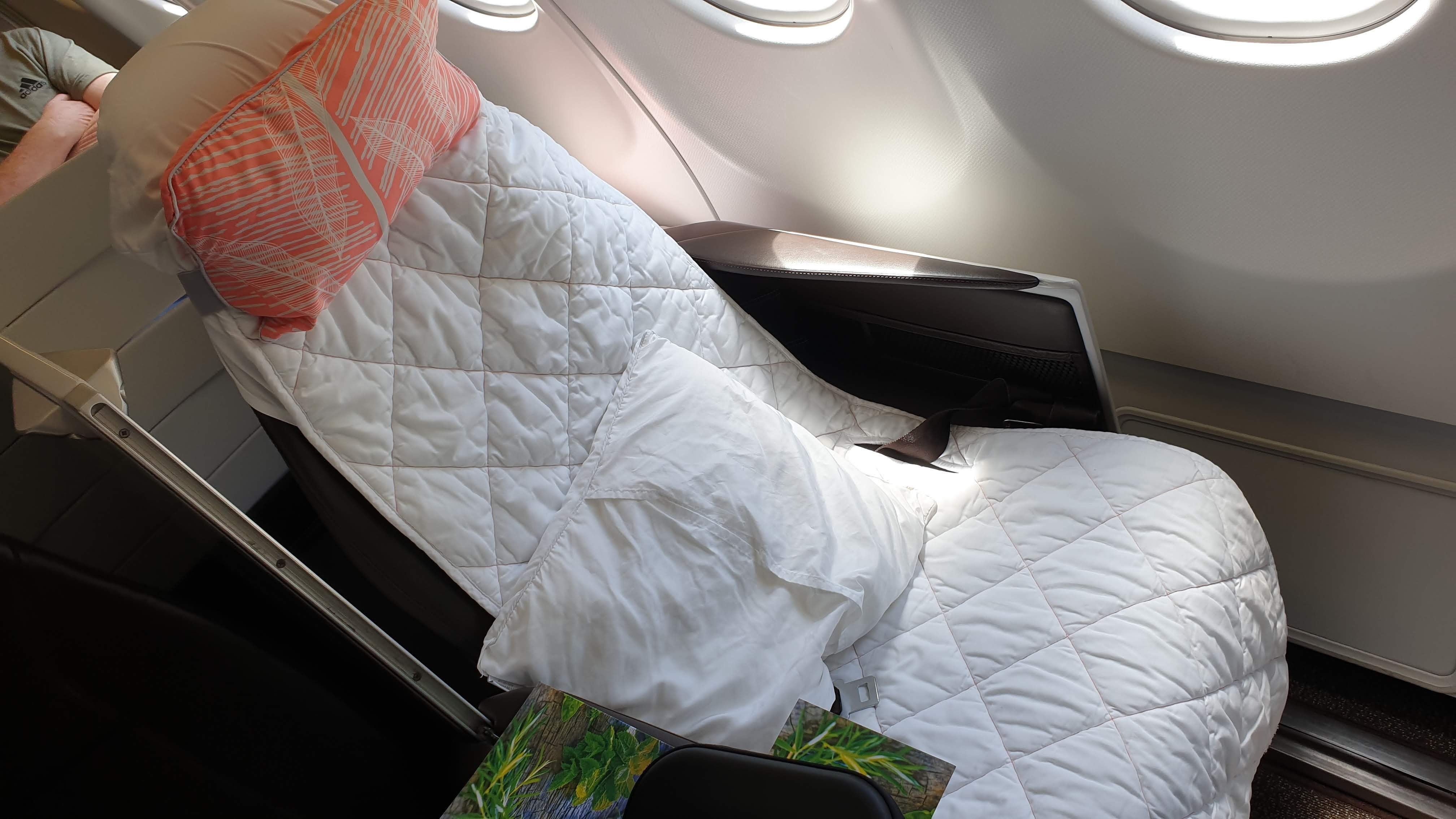 With only 18 Business Class seats the cabin isn’t overcrowded and utilising a 2-2-2 layout, couples can lower the privacy screen and enjoy the flight together. For singles travellers in seats next to the window, there is no direct aisle access and they will need to side step the footrest to leave their seat. If you’re looking for a little more privacy, bulkhead seats have the footrests set within the bulkhead making them feel a little more cocooned. You will also enjoy the perks of priority boarding, lounge access and 2 x 32kg baggage so no need to pack light.