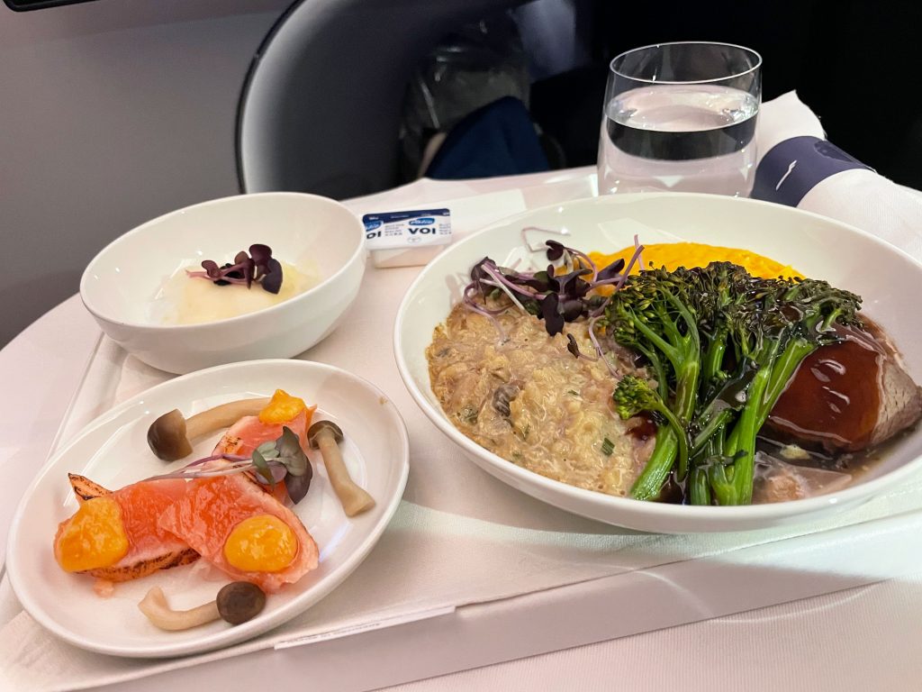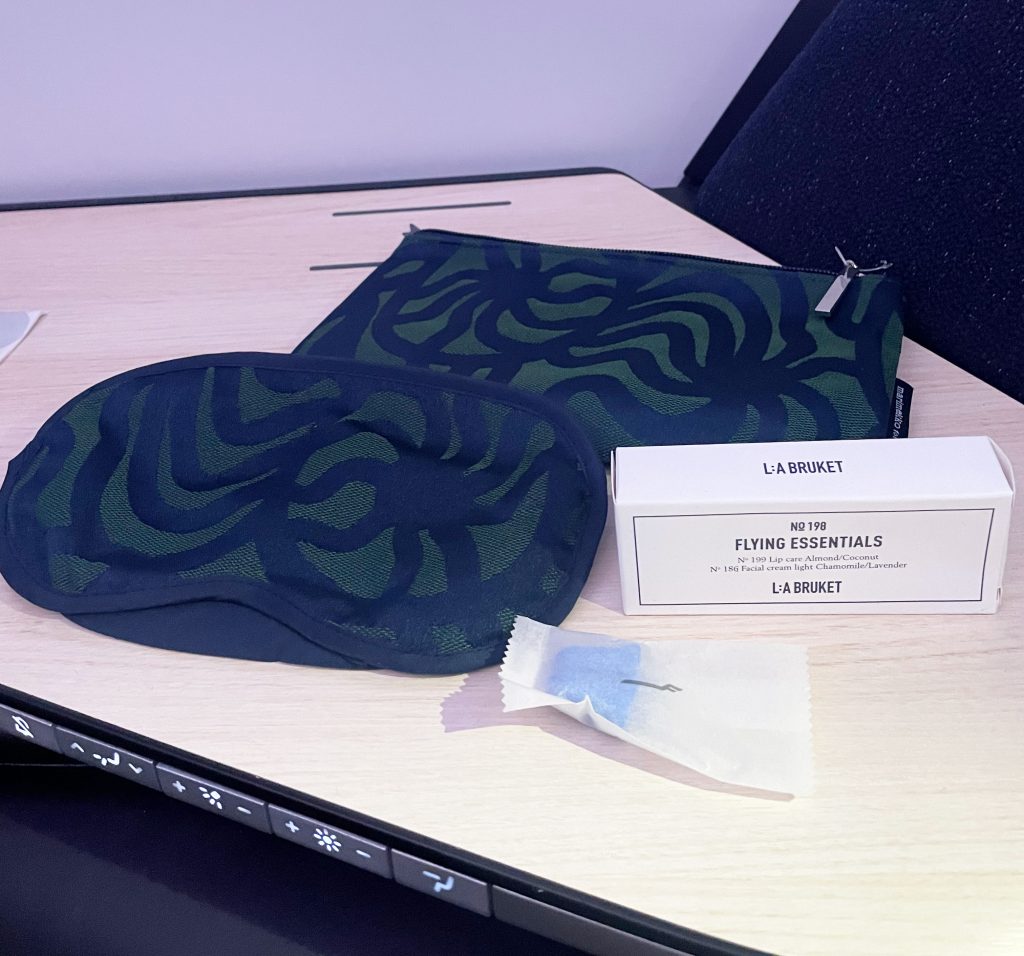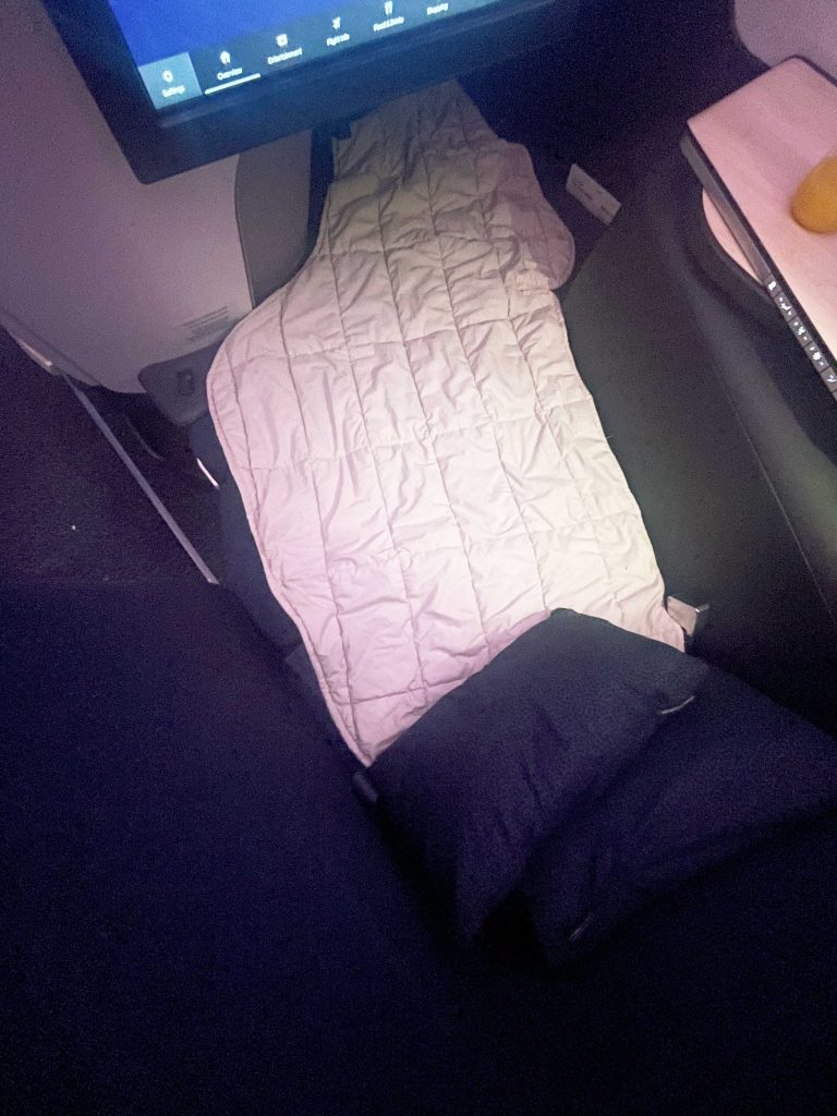 The A350 has one cabin of Business Class seats in a 1-2-1 configuration and all seats have direct aisle access. Window seats were angled outwards to the window and middle seats inwards toward each other. I was seated in 3D, a middle seat toward the front of the cabin. One thing I noticed was there was no storage down the middle of the cabin. This gave a much more open feel which was a nice touch.