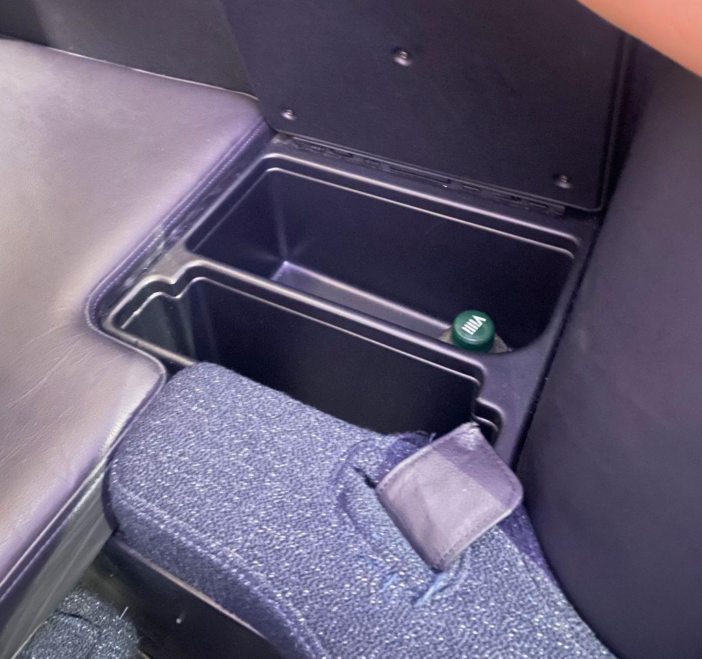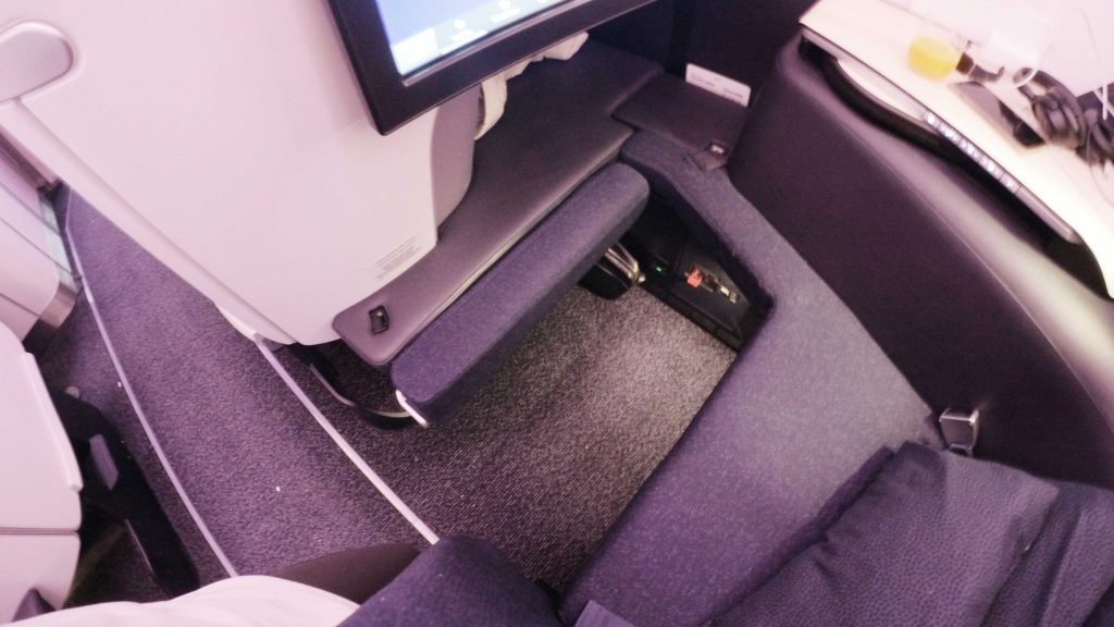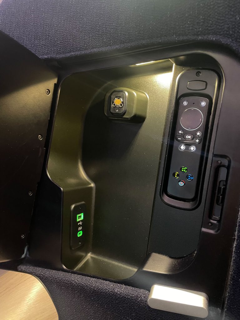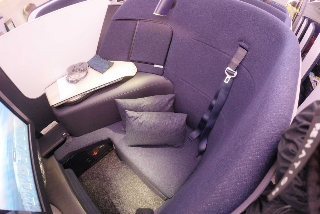 The cocoon shape gives a much wide seating space than a normal seat. The extra space was very noticeable and made for a more comfortable experience on a long flight. There is a full divider from the bench upward between middle seats that can be dropped for couples travelling together. The shape of the seat also means you can’t see any part of other passengers when seated which is great for privacy.