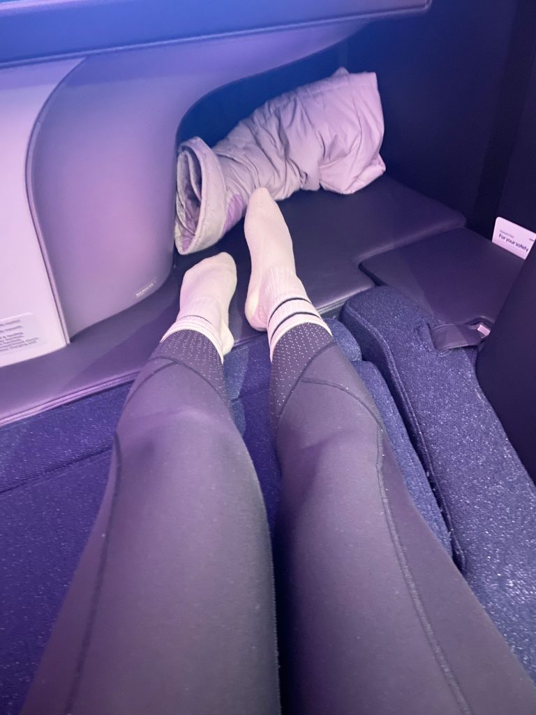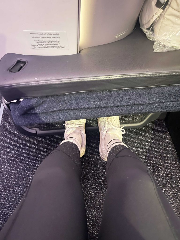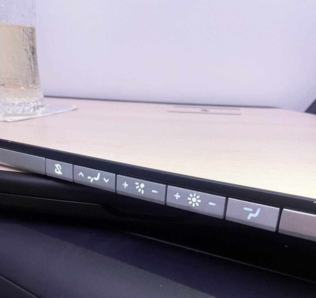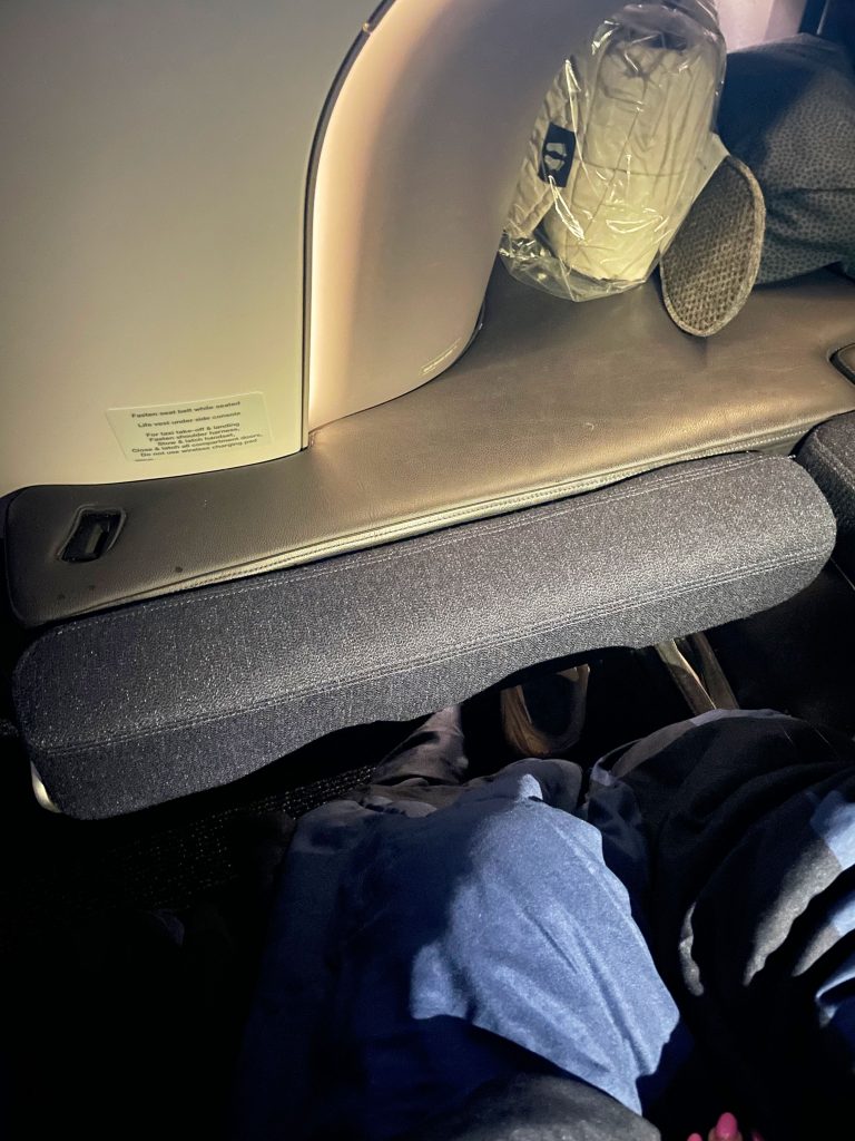 The cocoon shape gives a much wide seating space than a normal seat. The extra space was very noticeable and made for a more comfortable experience on a long flight. There is a full divider from the bench upward between middle seats that can be dropped for couples travelling together. The shape of the seat also means you can’t see any part of other passengers when seated which is great for privacy.