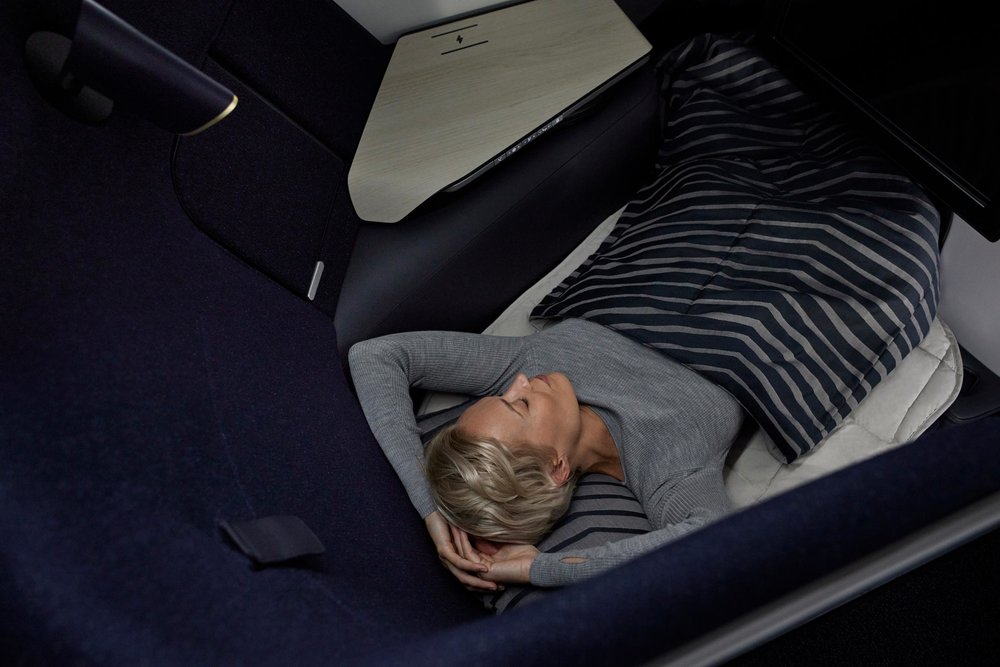 The seat’s innovative fixed contoured shell with no recline enables a wide variety of sitting and sleeping positions: you can sit at different angles, rest your feet on the ottoman or use infill panels to create a large flat surface. A mattress and duvet turn the space into a comfortable bed, and you can use the cushy pillows to relax in a variety of sitting positions. The high cocoon like shell of the seat provides privacy, while the divider between central seats can be lowered when travelling with a companion.