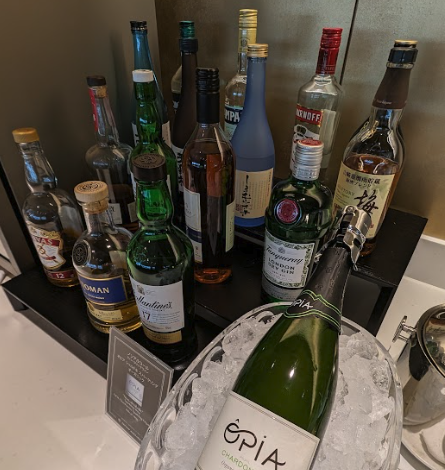 All drinks are self-serve ranging from a big selection of wine and bubbles, with the default champagne being Pierre de Bry Brut, or Joseph Perrier if you’re lucky enough to visit the Red Suite. There is a self-serve draft beer machine and coffee machine.