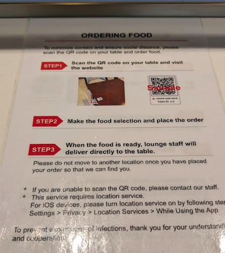 JAL First Class Lounge uses a QR-code scanning system for food, although there are a few servers lingering around, if table service is preferred. You can order the food to be freshly prepared and delivered to your seat just by using your mobile and scanning the code on the tables, taking you to the online menu. There is also a small buffet for light nibbles.