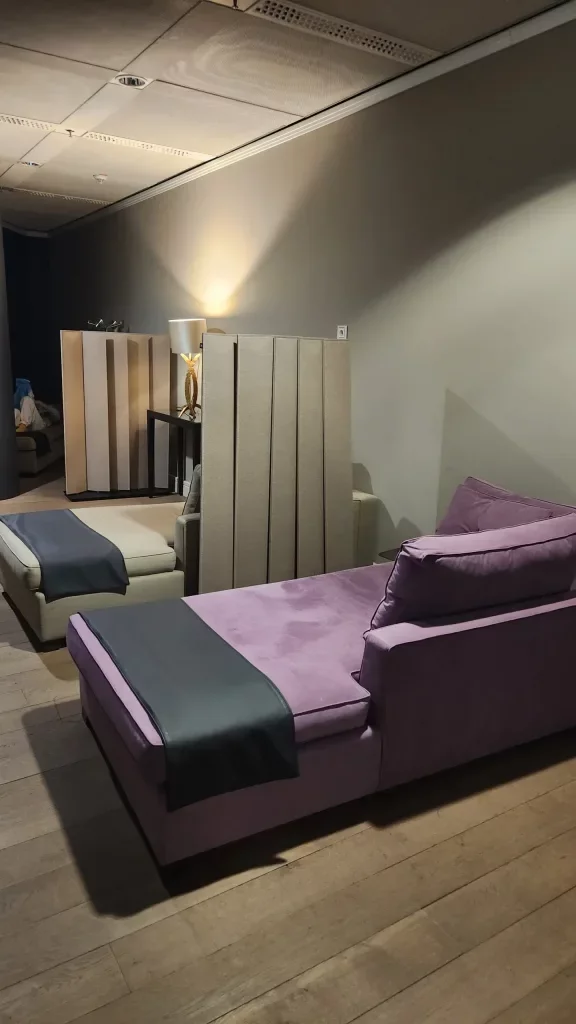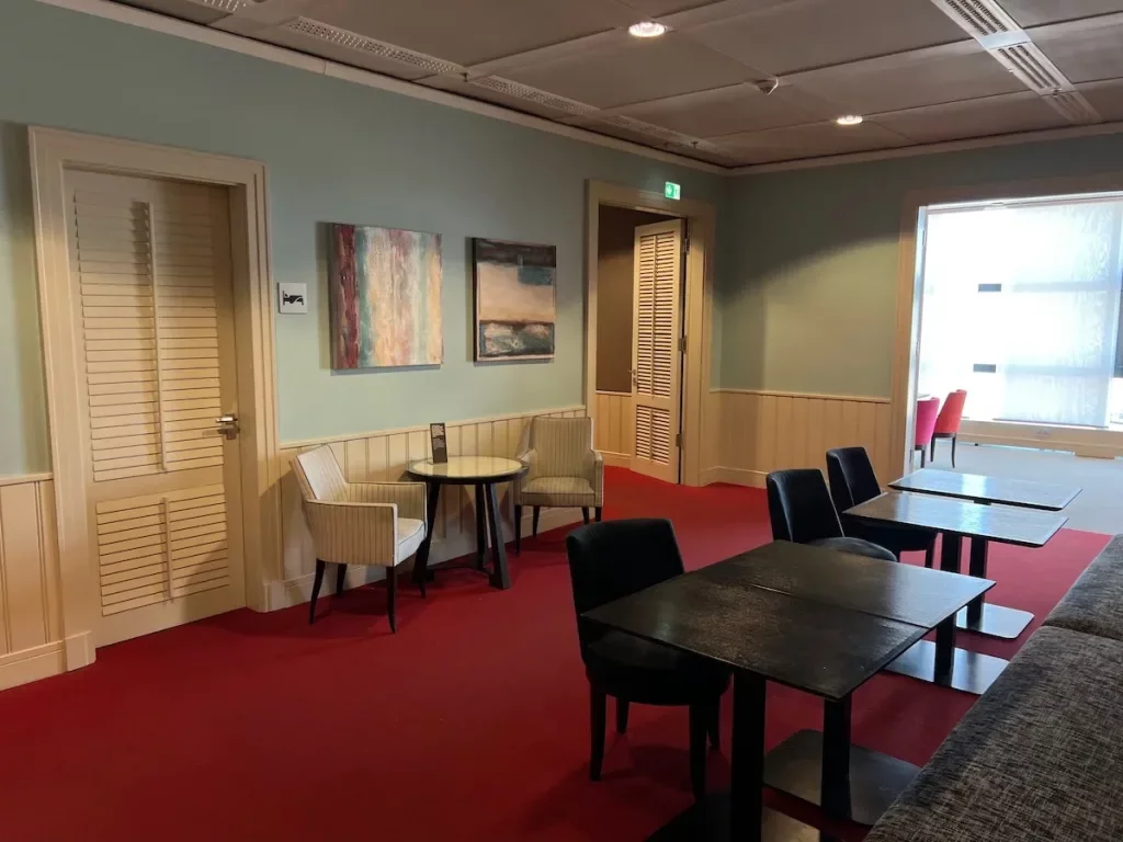 The lounge’s contemporary architecture accentuated by expansive windows in the main area creates an airy atmosphere, while secluded rooms at the back offer a snug setting with panoramic views of the tarmac.