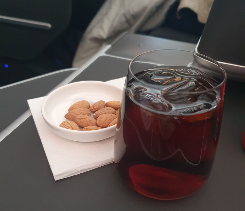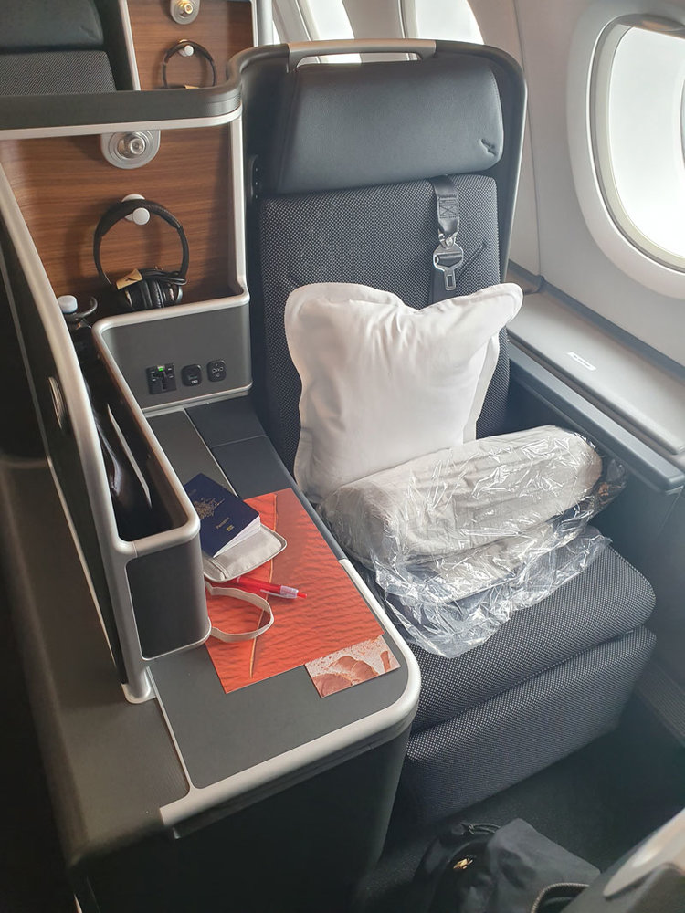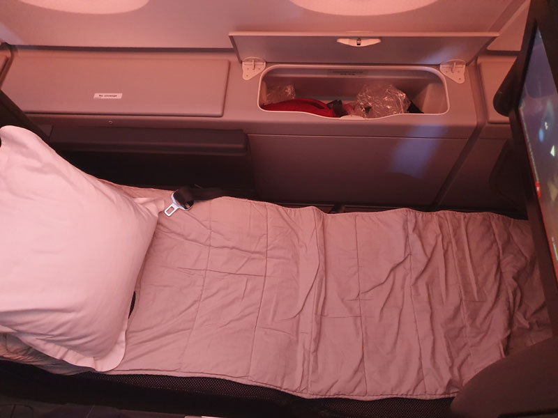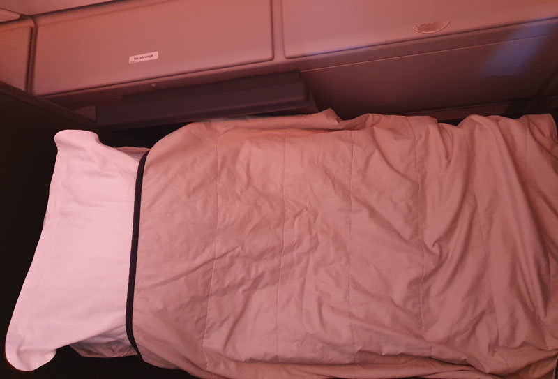 The Business Suite seat converts into a bed at the push of a button and can be adjusted to whatever position you like with options to increase the lumbar support and footrest. When converted the bed extends into the footwell under the entertainment screen, apart from narrowing slightly at the footwell this makes for a relatively straight bed. For added comfort a mattress topper, duvet and pillow are provided, the pillows are a really good size and felt more substantial than what is provided in other business classes.