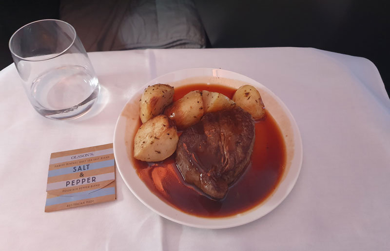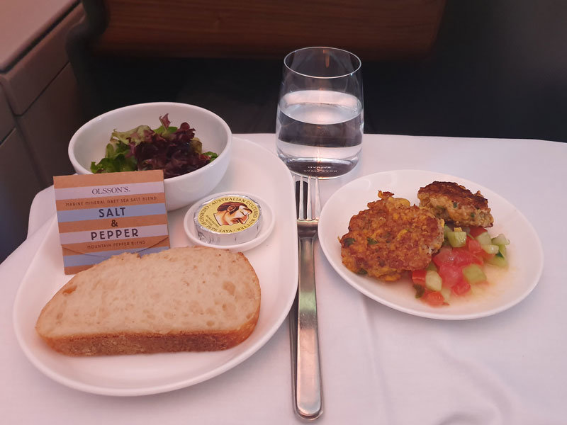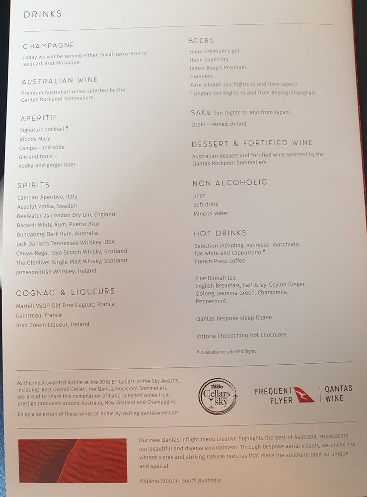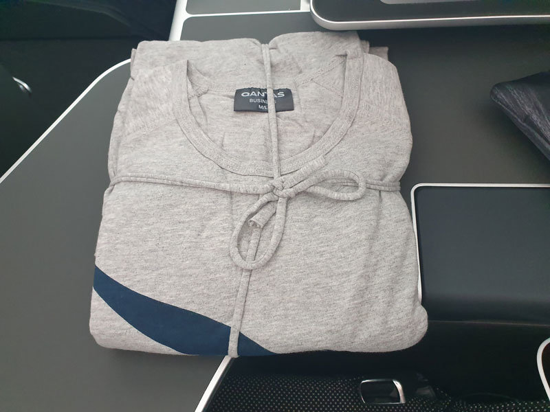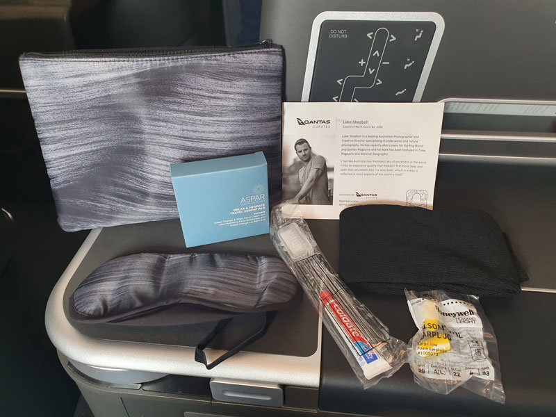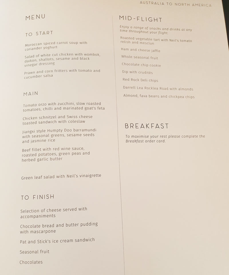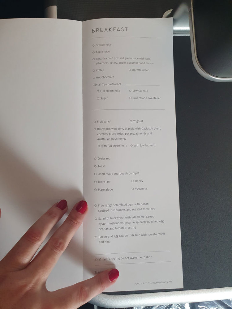 Greeting us at our seats was the bedding, menu, amenity kit and complimentary headphones, once seated we were offered the iconic Qantas pyjamas and a welcome drink while we perused the menu. The amenity kit is filled with the travel essentials needed during your flight including an eye mask, tooth cleaning kit, socks, earplugs and ASPAR skincare. Shortly after take-off we were able to pre-order our breakfast to save time the following morning and maximise our inflight sleep. The breakfast menu is fully customisable with options including juice, coffee, pastries, eggs and a salad.