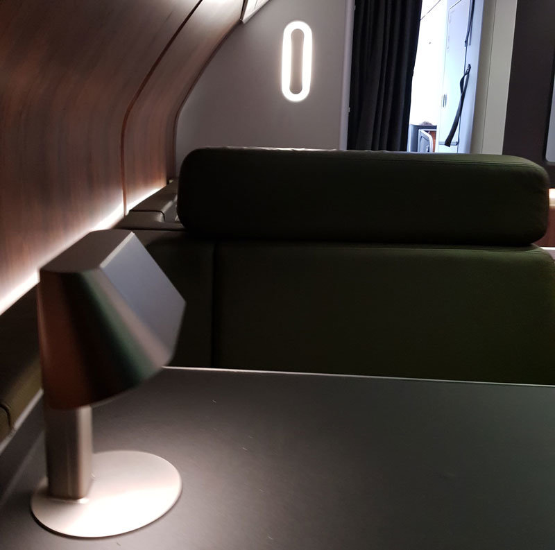 The A380 onboard lounge that is available to first and business class passengers has also been updated. Located upstairs the lounge is fitted out with booth style seating in dark green upholstery to allow small groups to sit together, this makes the lounge feel intimate and cosy. Inside the lounge is a self-serve bar which is filled with a selection of self-serve drinks and snacks.