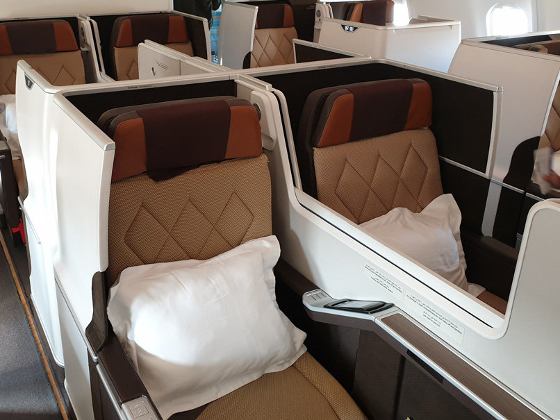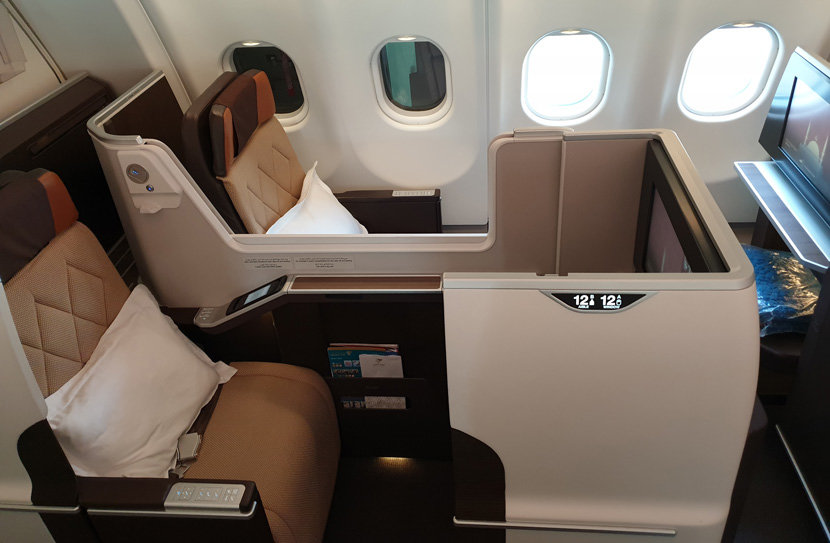 The business class seats are set out in a 2-2-2 configuration, with a generous seat width of 22.8 inches. Similar to the Japan Airlines and Korean Air layout, the staggered design of the window seats mean each passenger still has dedicated access to the aisle. Each pair of seats features a retractable privacy screen, which when completely closed creates an almost private suite for those on the window. The seat itself is very comfortable, converting to a completely flat bed with luxurious bedding, including a quilted blanket.