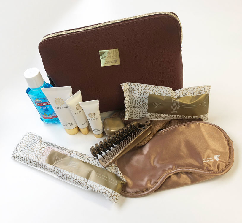 Upon arriving at your seat you are greeted by the bedding for your seat, a set of complimentary noise cancelling headphones and an Amouage amenity kit. The amenity kit comes in a luxurious leather pouch an is unisex and filled with everything you would need during the flight including, body lotion, facial moisturiser, lip balm and even a shaving kit and hairbrush. Other items include the usual dental kit, mouthwash, socks, eye mask and ear plugs.