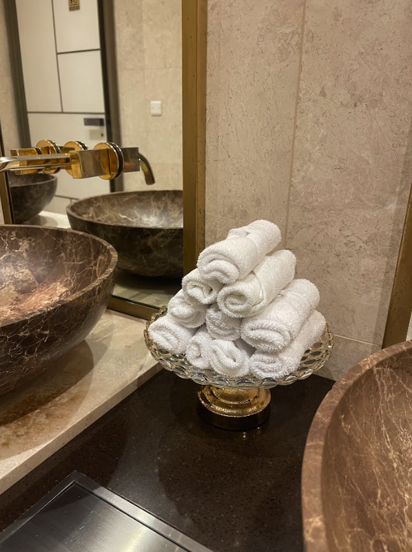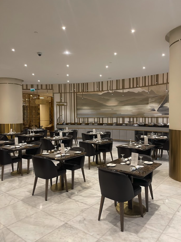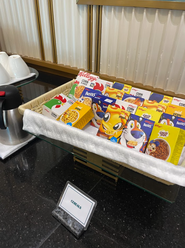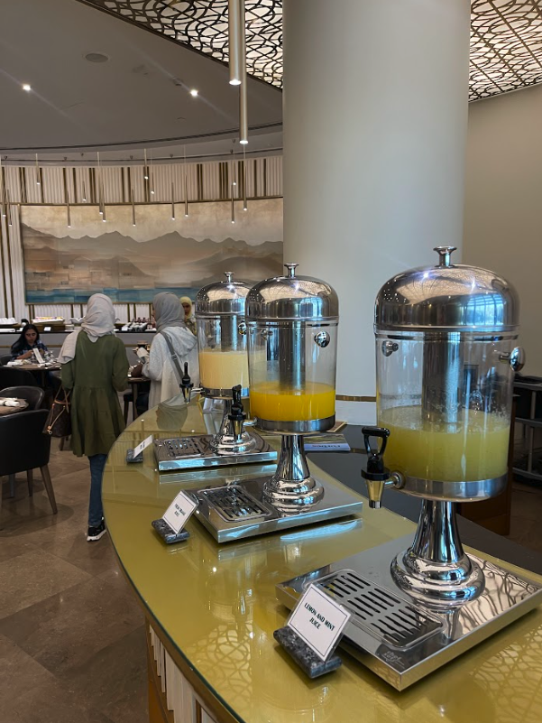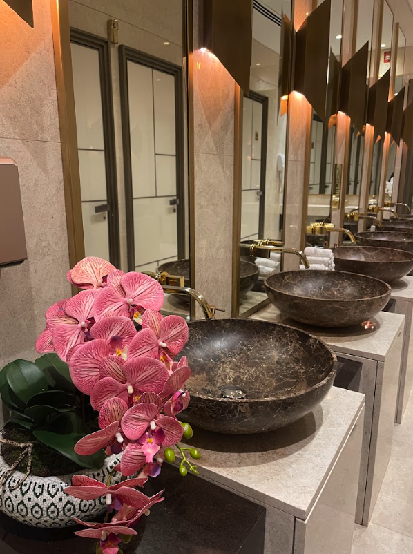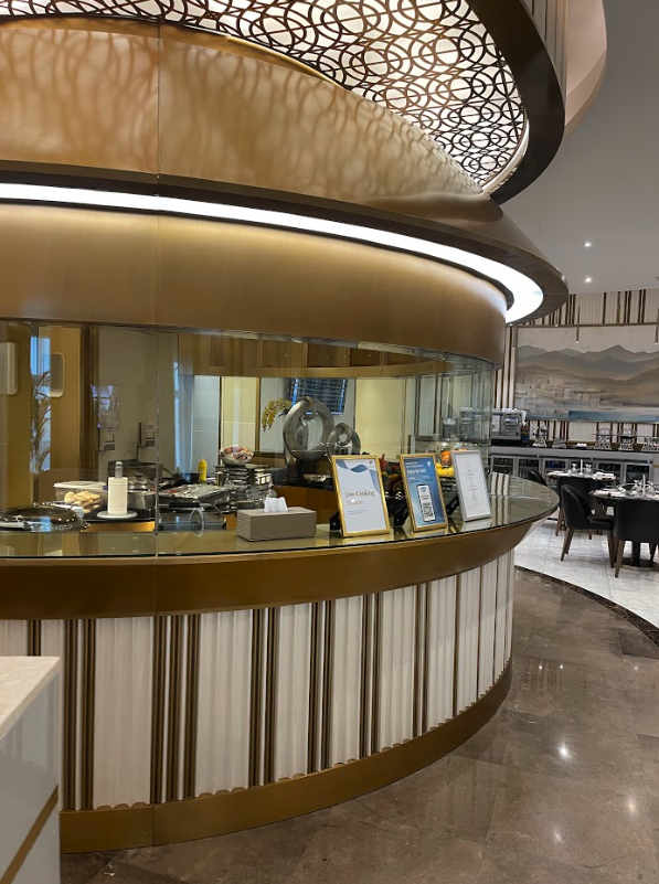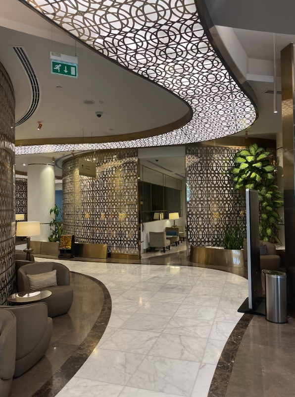 The Oman Air Business Lounge is located in the central area of the terminal, right by the duty free shopping. You’ll need to head up to the fifth floor, from the departure level on the fourth floor. Here you’ll find the very lavish exterior to the First and Business Class Lounge.