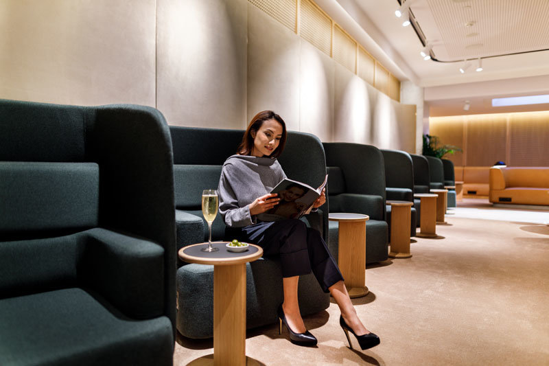 The lounge also features a unique workspace, giving travellers the choice to work in an open communal setting or individual lounge chairs with high dividers. USB and charging ports are located throughout the lounge with WiFi to keep everyone connected.