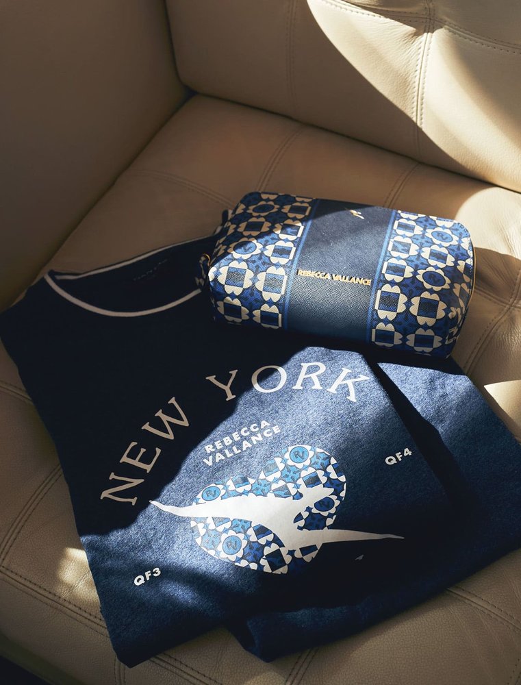 Partnering with Aussie fashion designer, Rebecca Vallance, to mark the occasion, the PJs feature a monogram of the Qantas “Roo” and Rebecca Vallance logo, while also incorporate the flight numbers QF3 and QF4 into the bespoke New York heart design.
