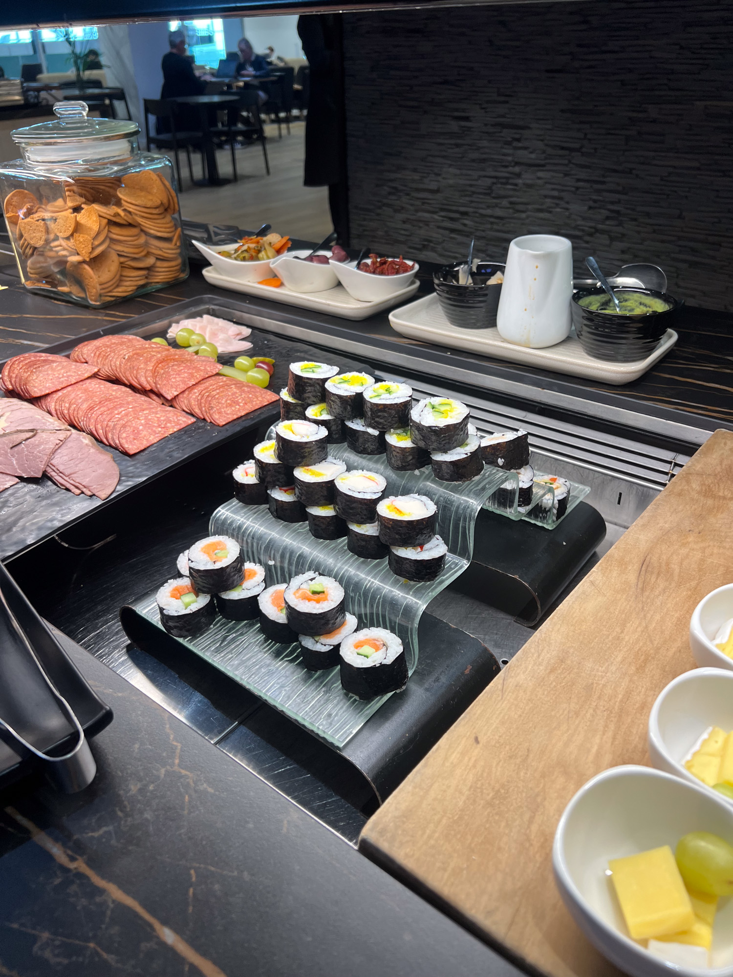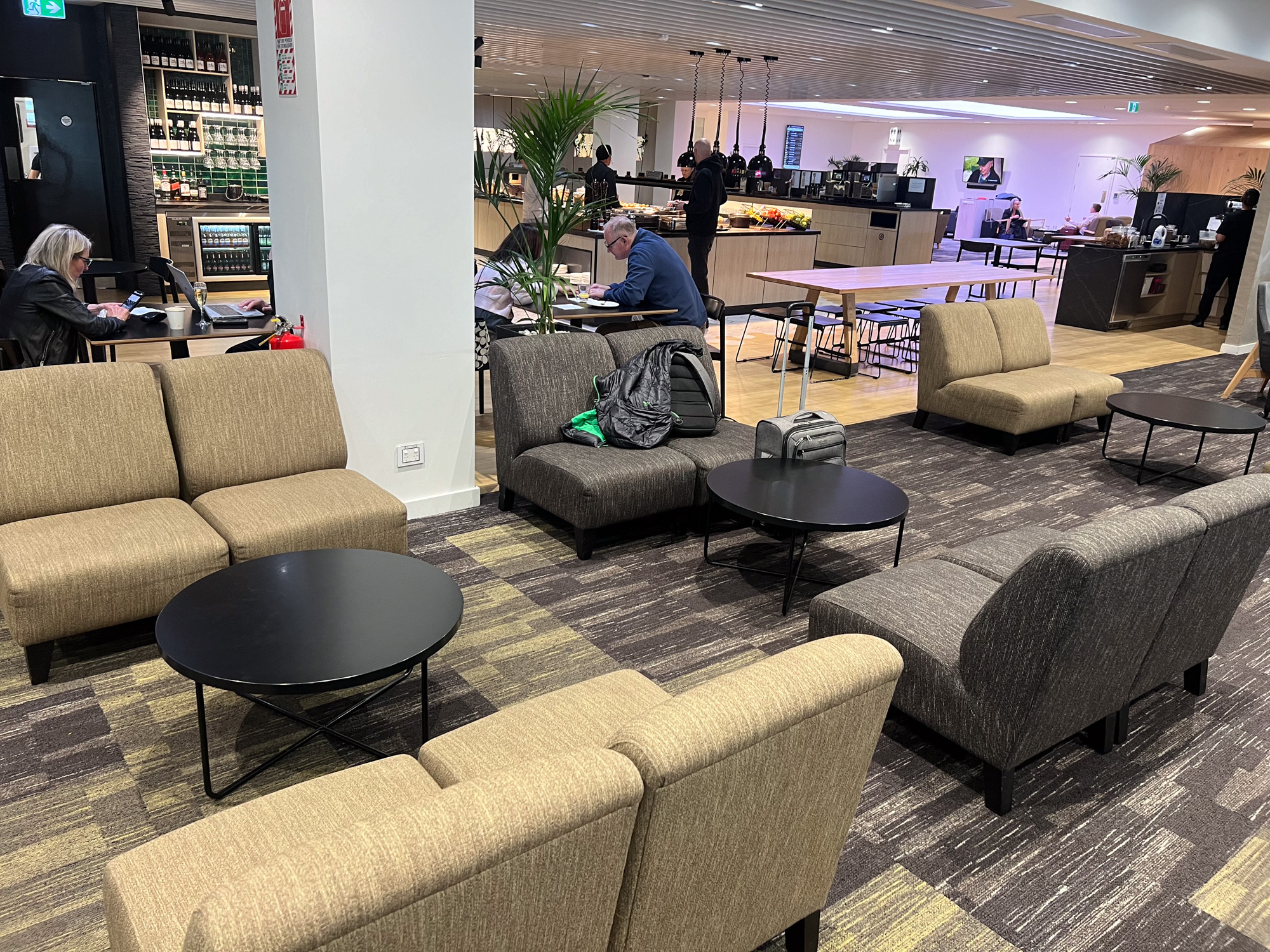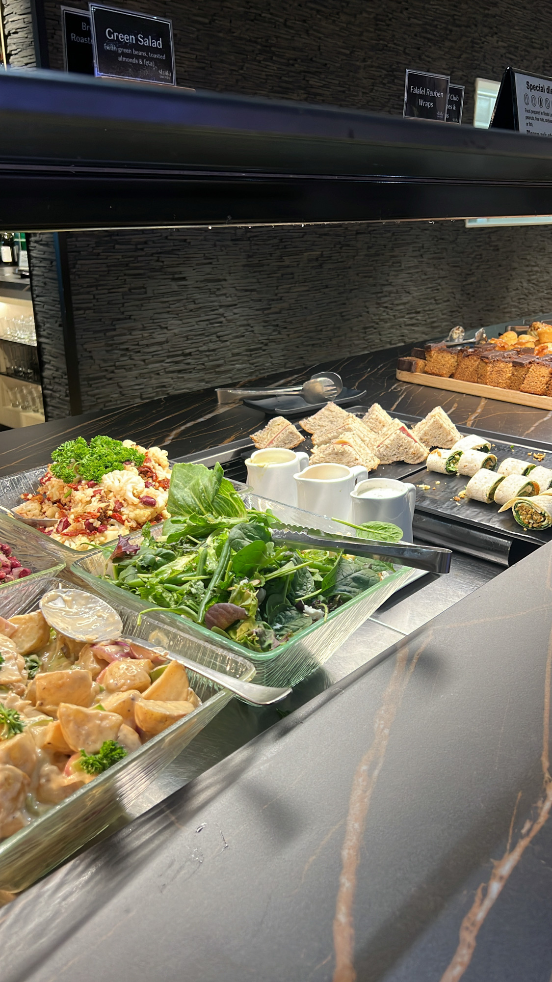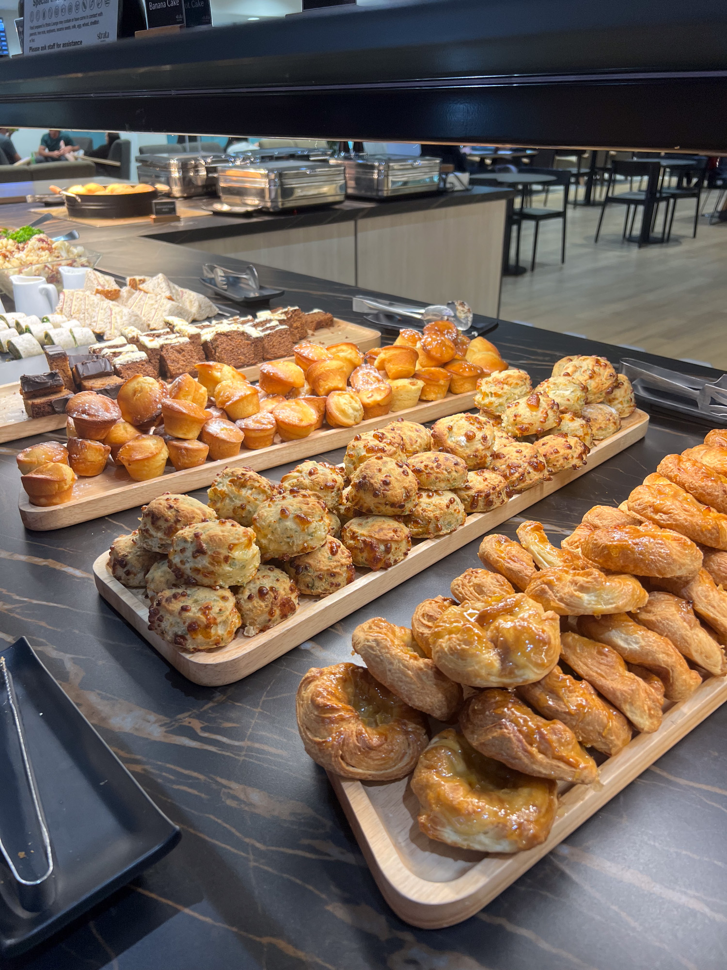 The lounge was serving lunch items by the time we arrived at around 11.00am, and they had a good range of food available for self service. This included fresh fruit, fresh salads, wraps, sandwiches, cakes, pastries, scrolls, slices, tiramisu, tarts, sandwich stuffers, sushi, nibbles and four choices of hot food. The lounge lacked appropriate signage for gluten free, vegetarian and vegan options which we thought could inconvenience some travellers.