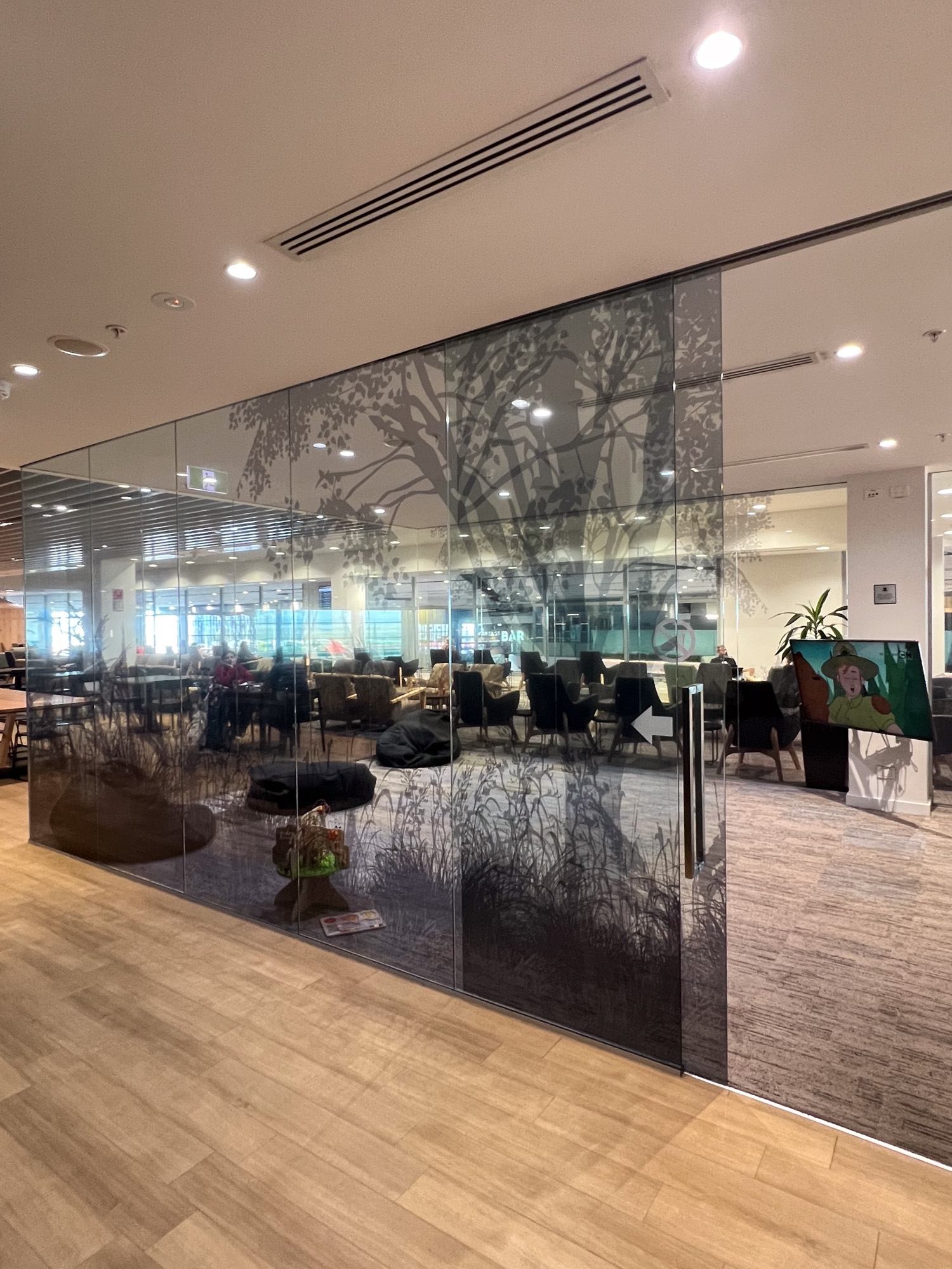 The conference room had a TV available for use and the kids room had beanbags, toys, a TV and tables and chairs. We found it interesting that you had to pay extra to go inside the private relaxation room, but we were told they were bookable sleeping pods accompanied by full-sized modern bathrooms.