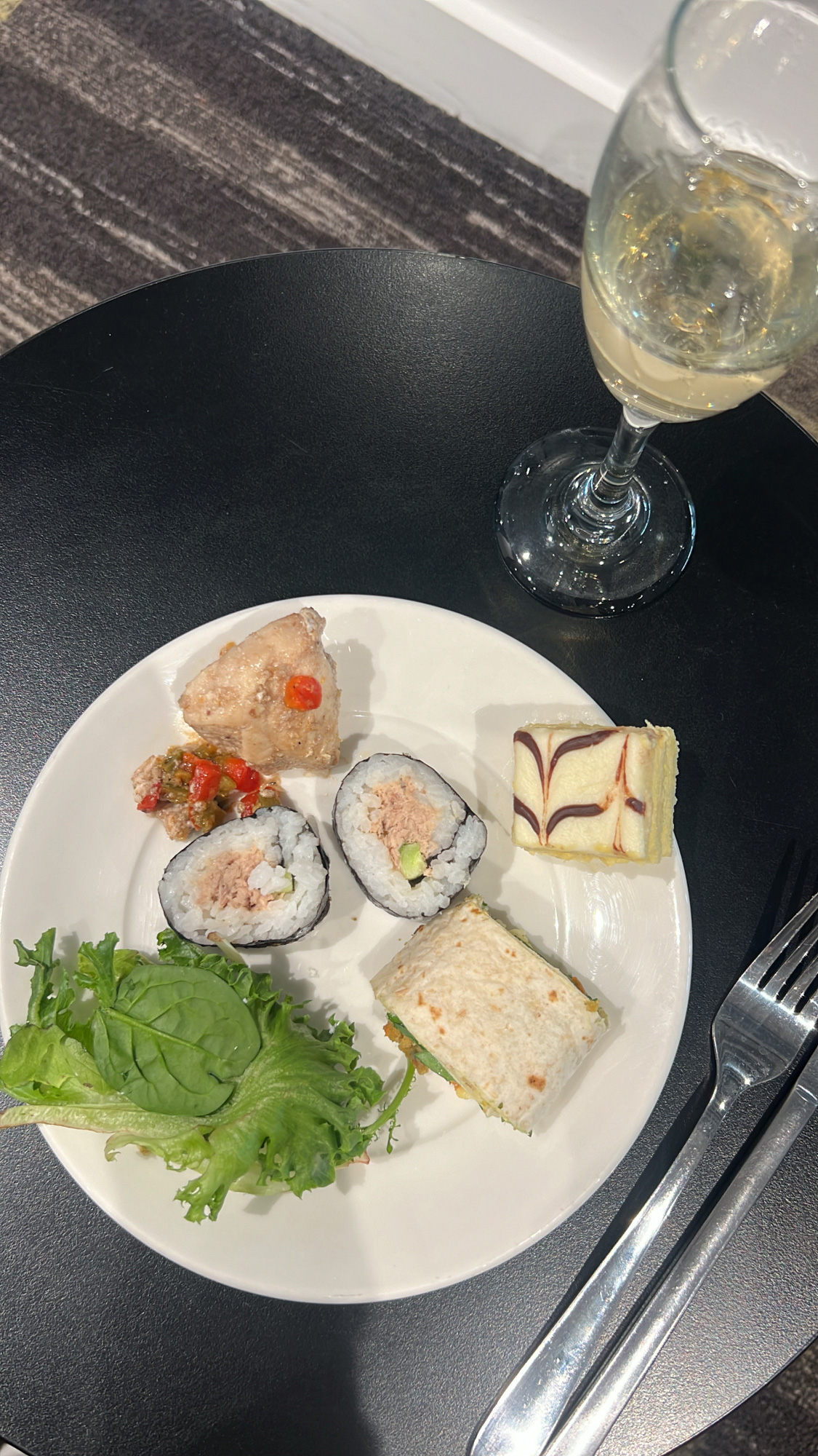We were ready for some lunch by midday and opted for the sushi, a falafel wrap, garden salad, jerk chicken and a vanilla slice as a sweet treat for afterwards. Each dish was jam-packed with flavour and made fresh. We topped it off with a glass of Villa Maria Sparkling Cuvee Brut which was equally as pleasant.