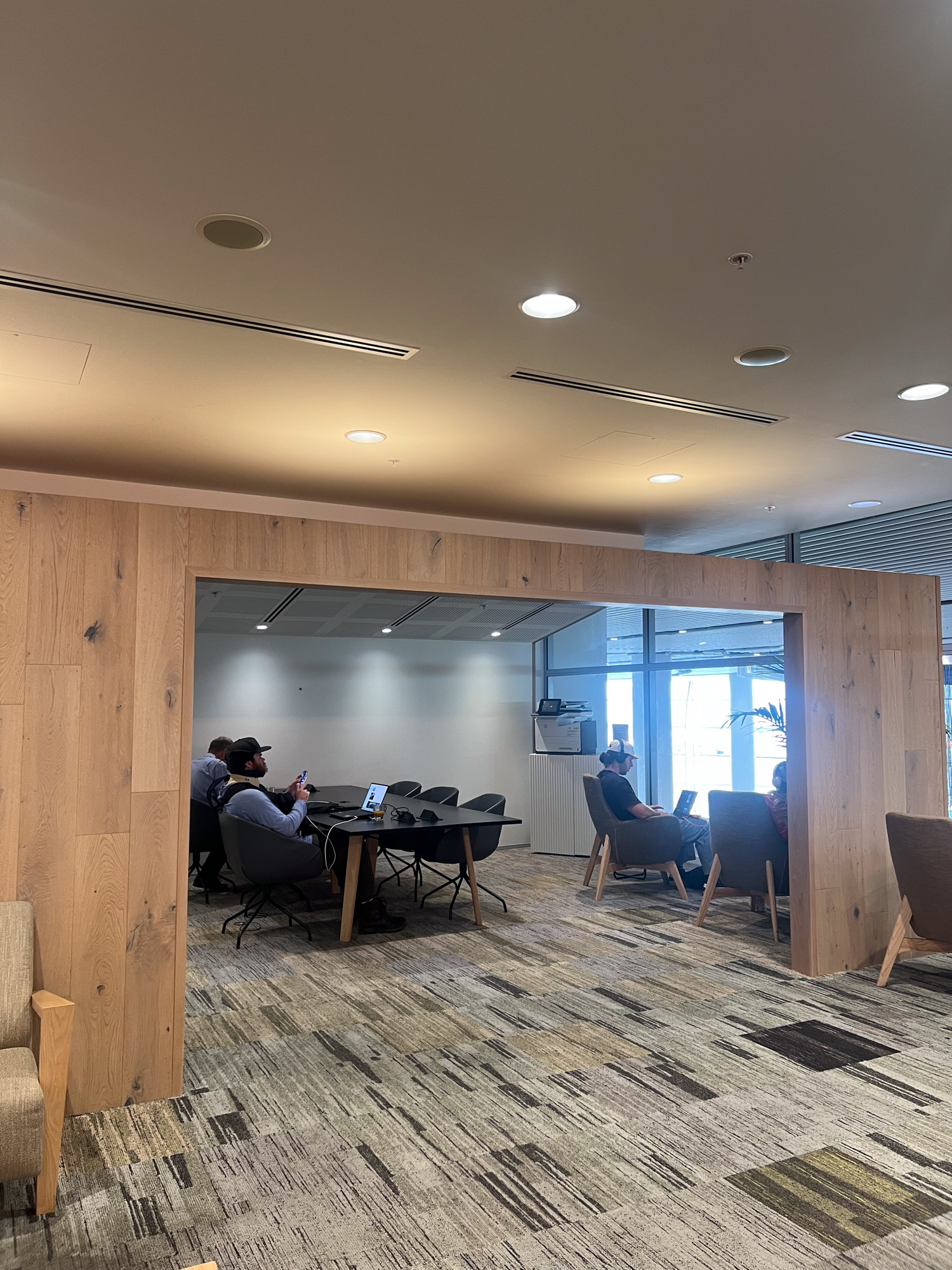 The lounge itself is basically one big room divided up into different sections with different seating options. To the left of this first dining room is a range of armchairs suited for up to four people as well as a little nook with a couple plush sofas. This is followed by a row of large armchairs that join up to a conference room and workstation with charging outlets.