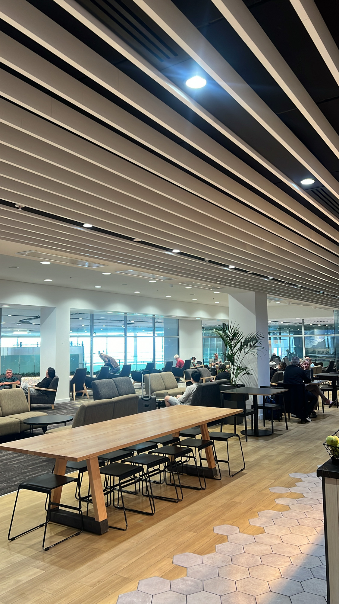 This lounge overall feels very modern and has additions such as showers, a relaxation room, kids room and conference room that elevate the feel. We would have liked to have seen a little more charging stations in the lounging areas.