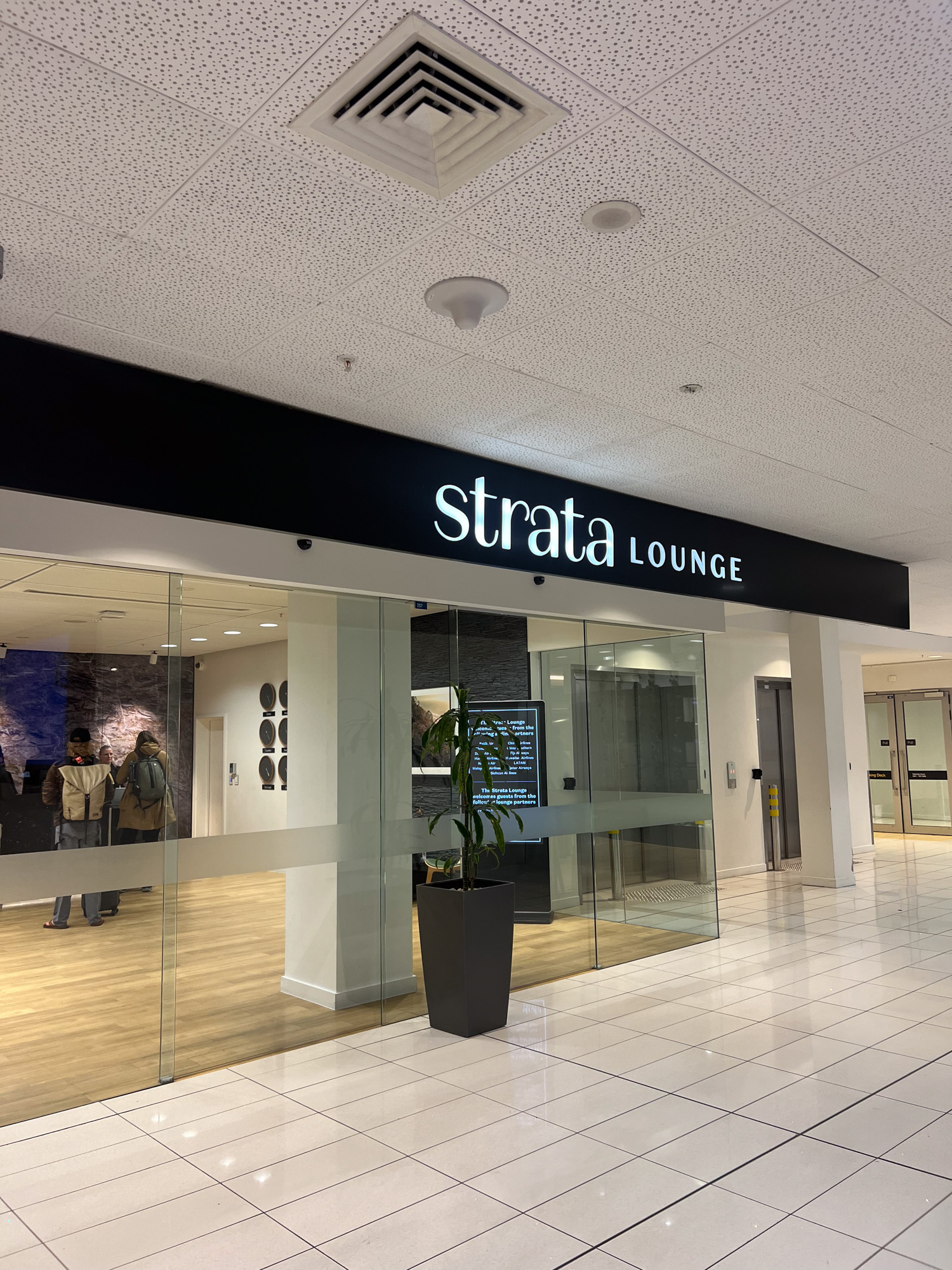After clearing security in the International Terminal, we took the escalator up and then turned left to enter the Strata Lounge. We were greeted by a friendly receptionist who checked our boarding pass and gave us a card with the Wi-Fi details, then she showed us to the entrance.