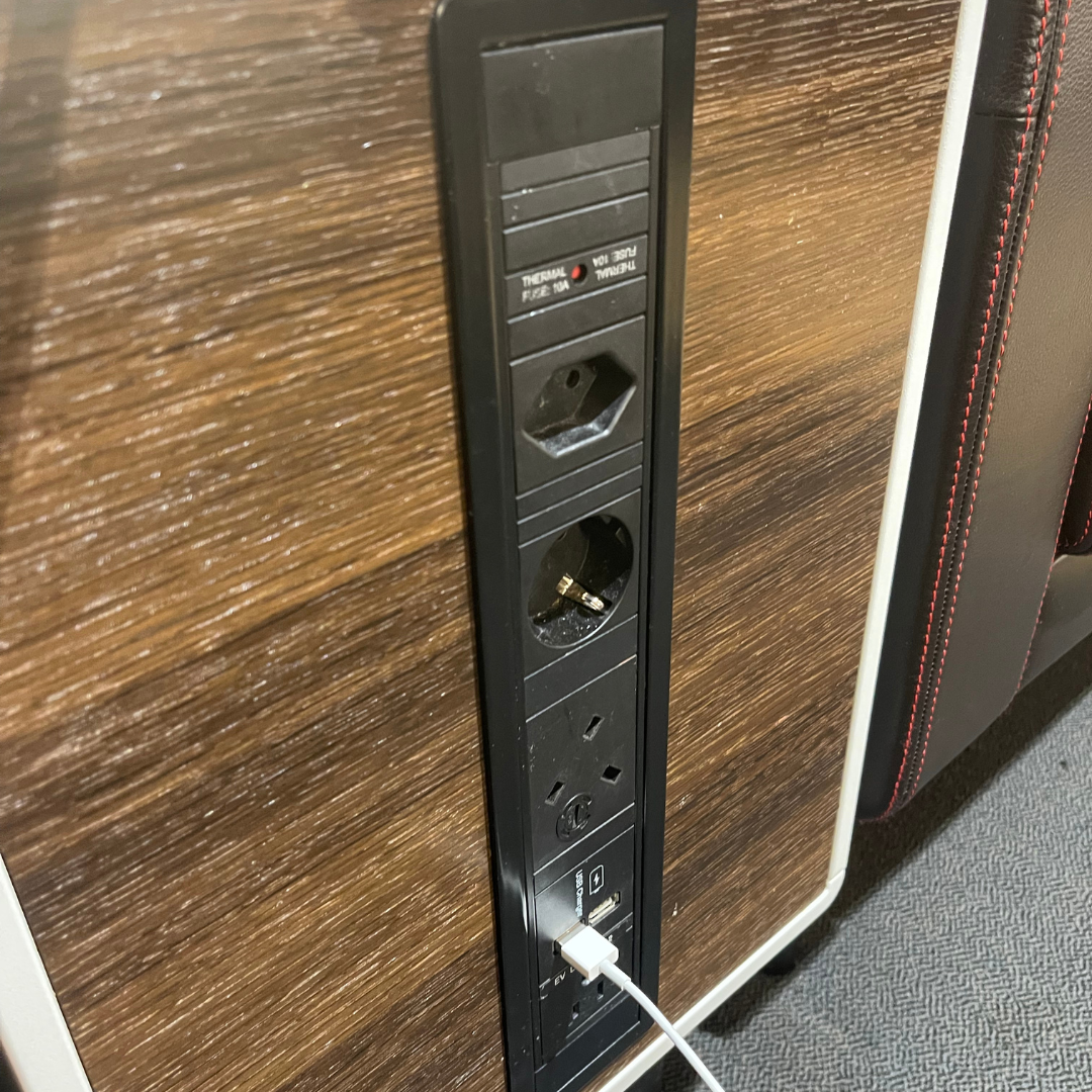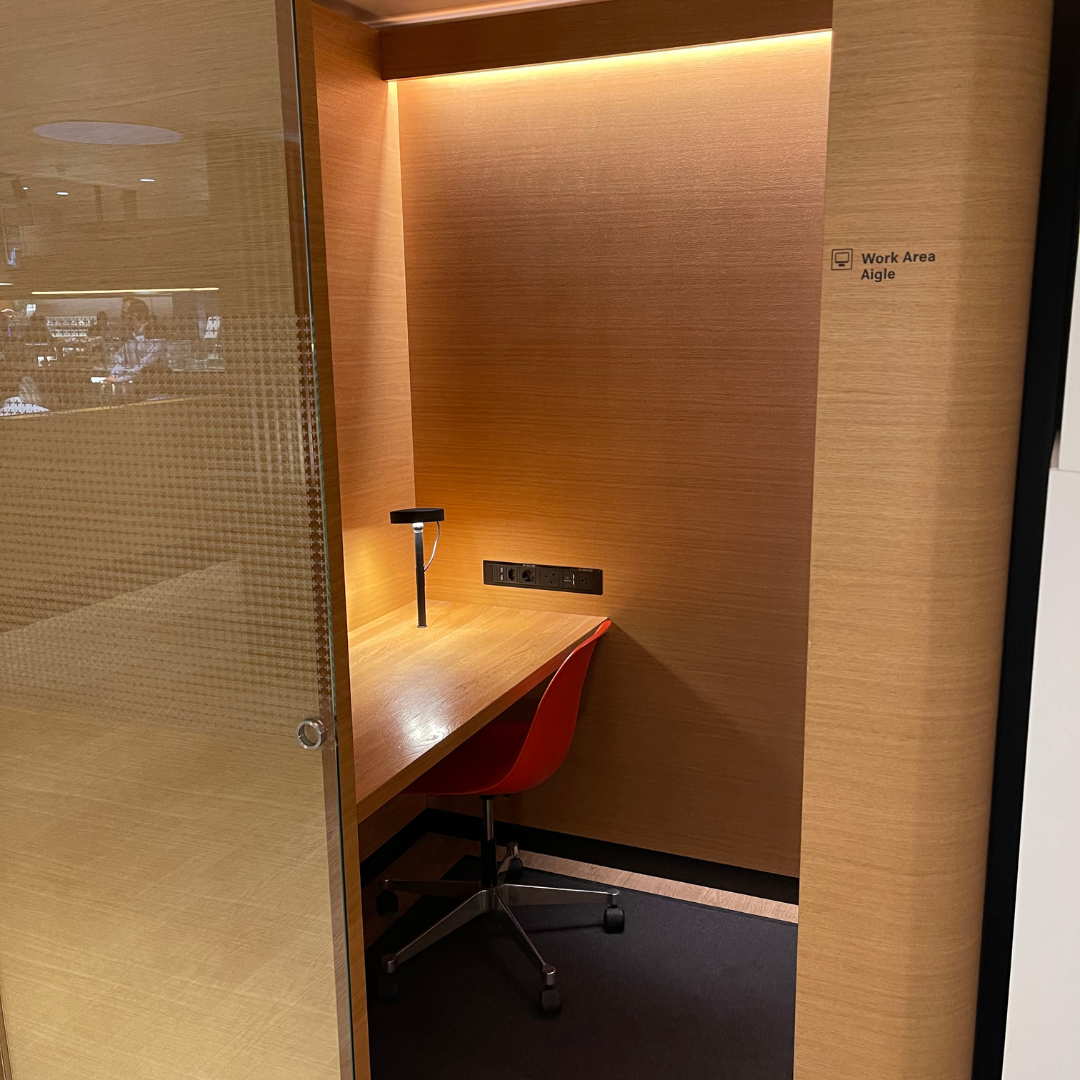 To the right of where we were seated, there were two available working booths, which had a chair and a desk along with a sliding door for privacy. This proved to be a nice work space later on, as it was quiet and had multiple charging ports.