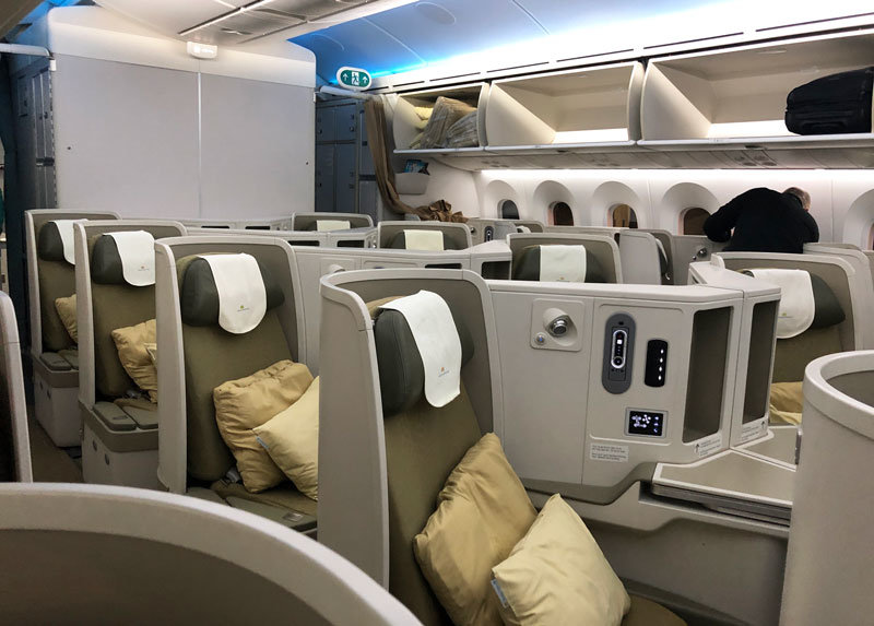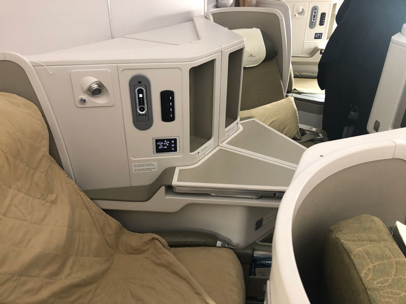 The Vietnam Airlines business class cabin is in a reverse herringbone 1-2-1 configuration, with the window seats being better suited to solo travellers and the middle seats angled towards each other better for couples.