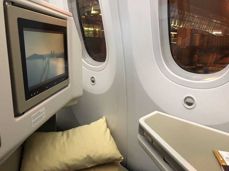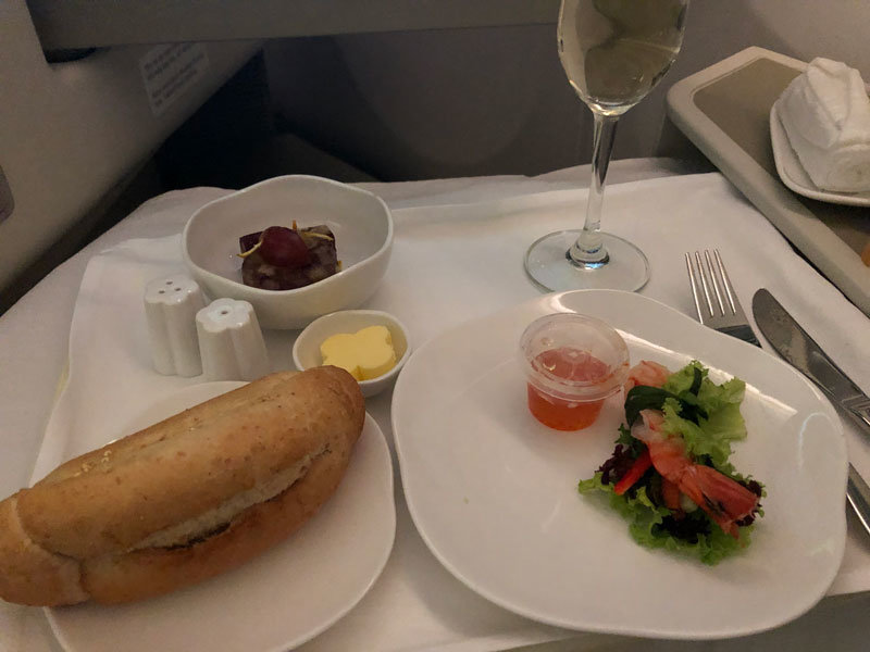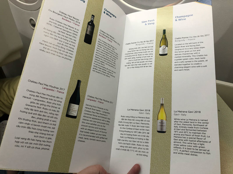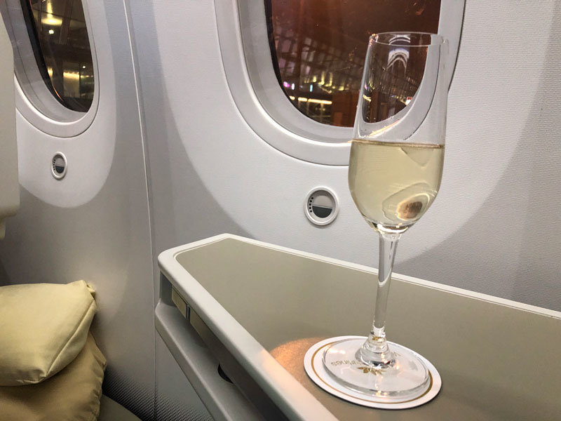 Once settled we were offered a choice of water, watermelon juice or champagne as a welcome drink along with the dining and wine menus, the extensive wine list included Champagnes and wines from France and Italy. After this lovely welcome, unfortunately, there was then about an hour wait on the plane before we started moving, it wasn’t clear what the reason for this was but we were offered newspapers and magazines during the wait.
