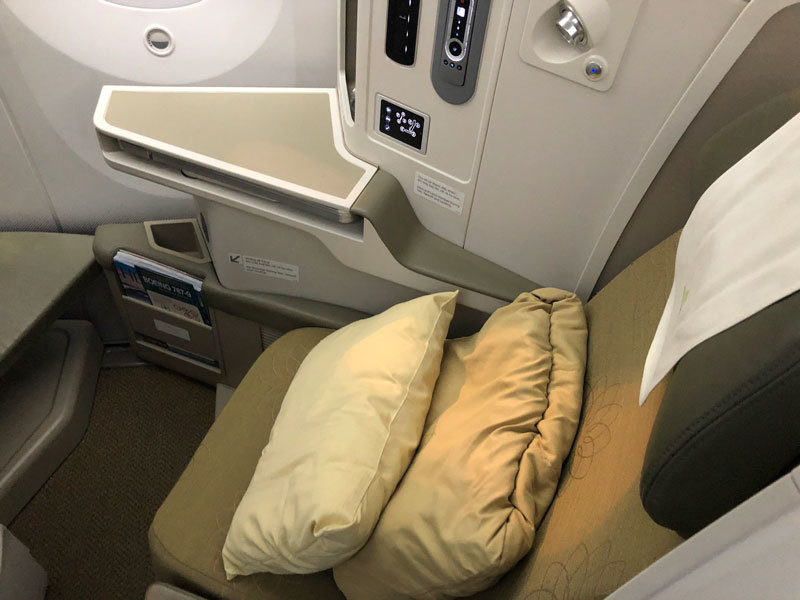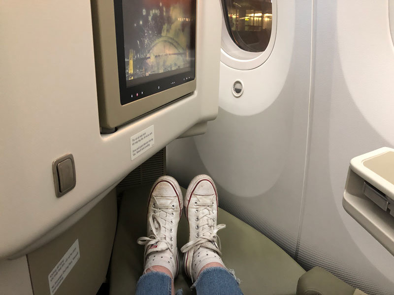 The business class seat is very roomy and comfortable with an adjustable armrest on the outside and footrest. As this was a night flight, before take-off we were offered a seat cover, similar to a mattress topper but not as padded, to avoid sleeping directly on the seat. When converted to a bed the seat reaches just under two meters in length with room to bend your legs to either side. The pillow and blanket provided just the right amount of comfort and warmth without being too hot.