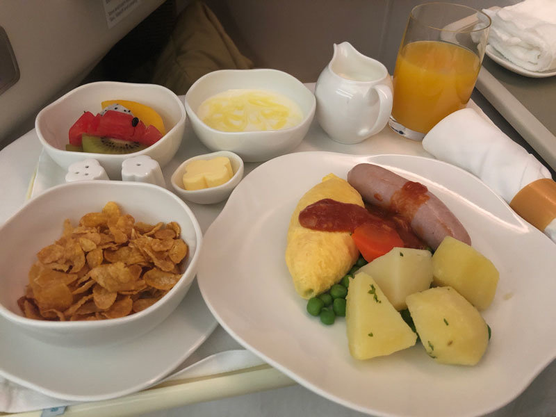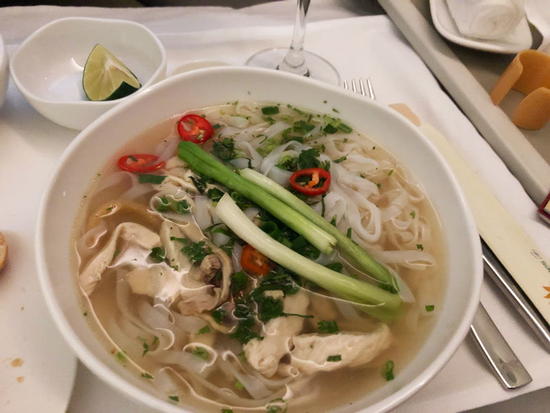 An hour and a half before landing our breakfast orders were taken. We had the option of Vietnamese Pho, Vegetable Omelette or a cold dish accompanied by Yoghurt. Cereal, fresh fruit and bread, tea, coffee and juice was also available. The omelette was light and fluffy and overall the whole breakfast meal was very filling and great after a night flight.