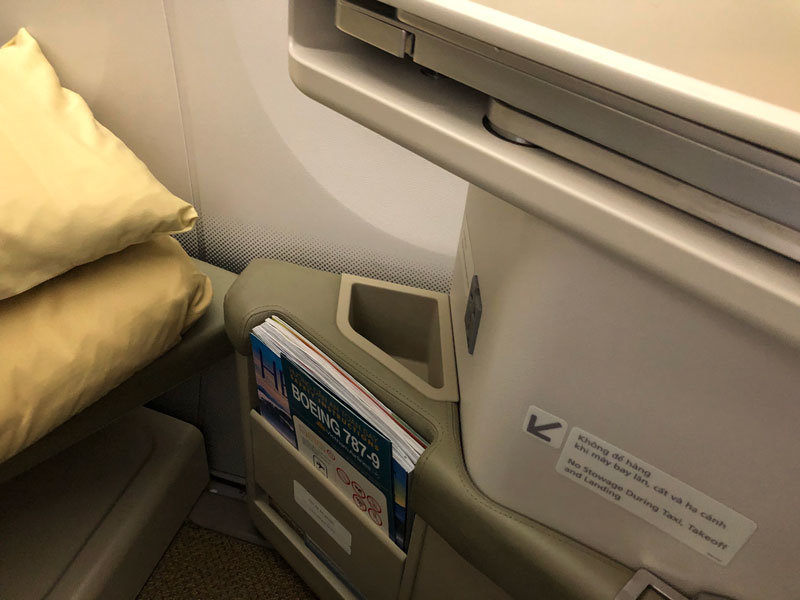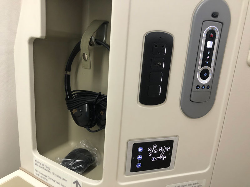 Seated in the window seat we had maximum privacy facing away from the cabin, with everything we needed within arms reach. Complimentary headphones, seat and entertainment controls are located in the console with a small amount of storage space with the headphones. The power outlets, seat and entertainment controls are here as well, this is great as it keeps everything in easy reach when seated upright or reclined. The entertainment controller is a bit redundant because of the touch screen but the call and light buttons are located here as well.