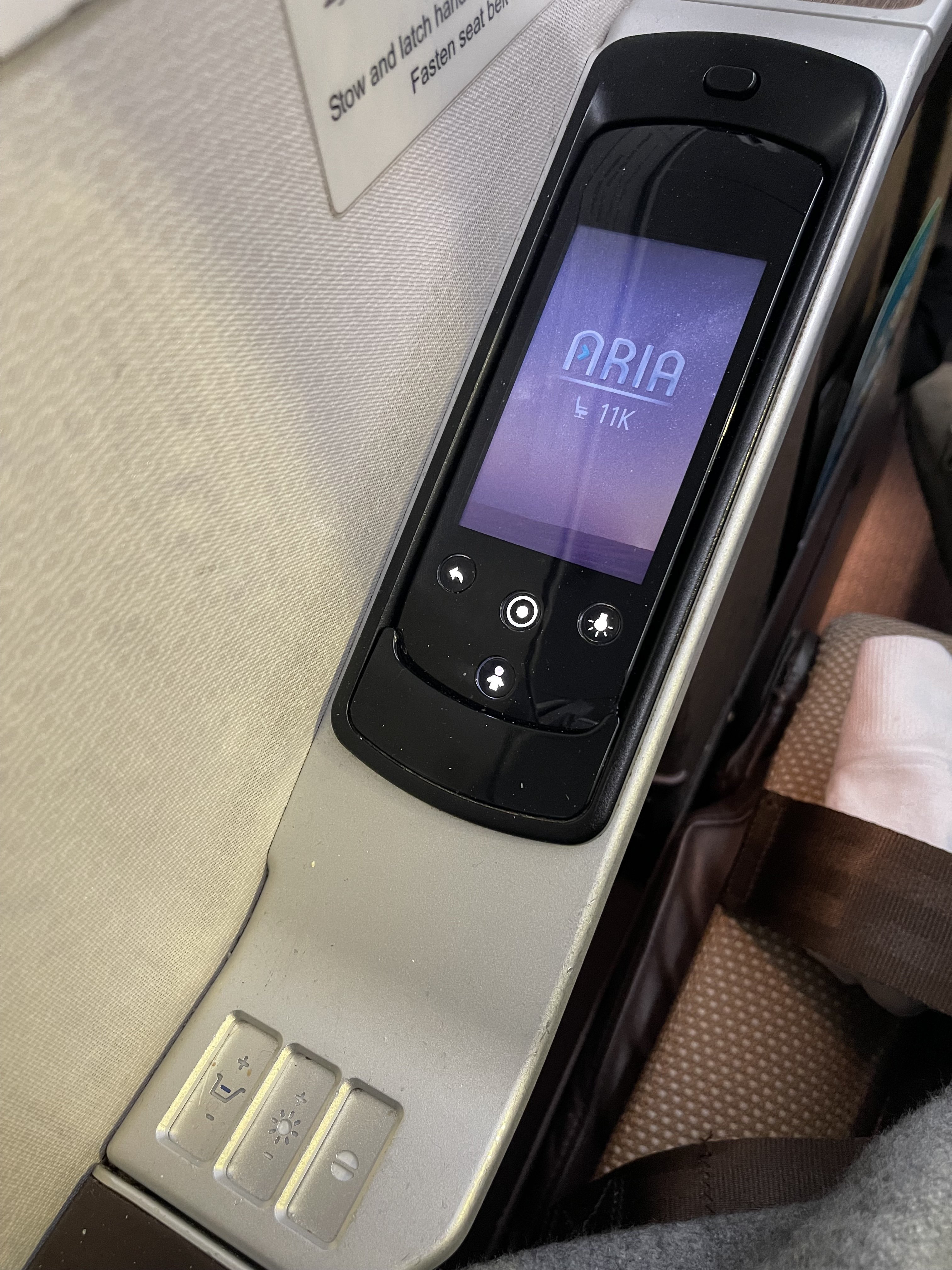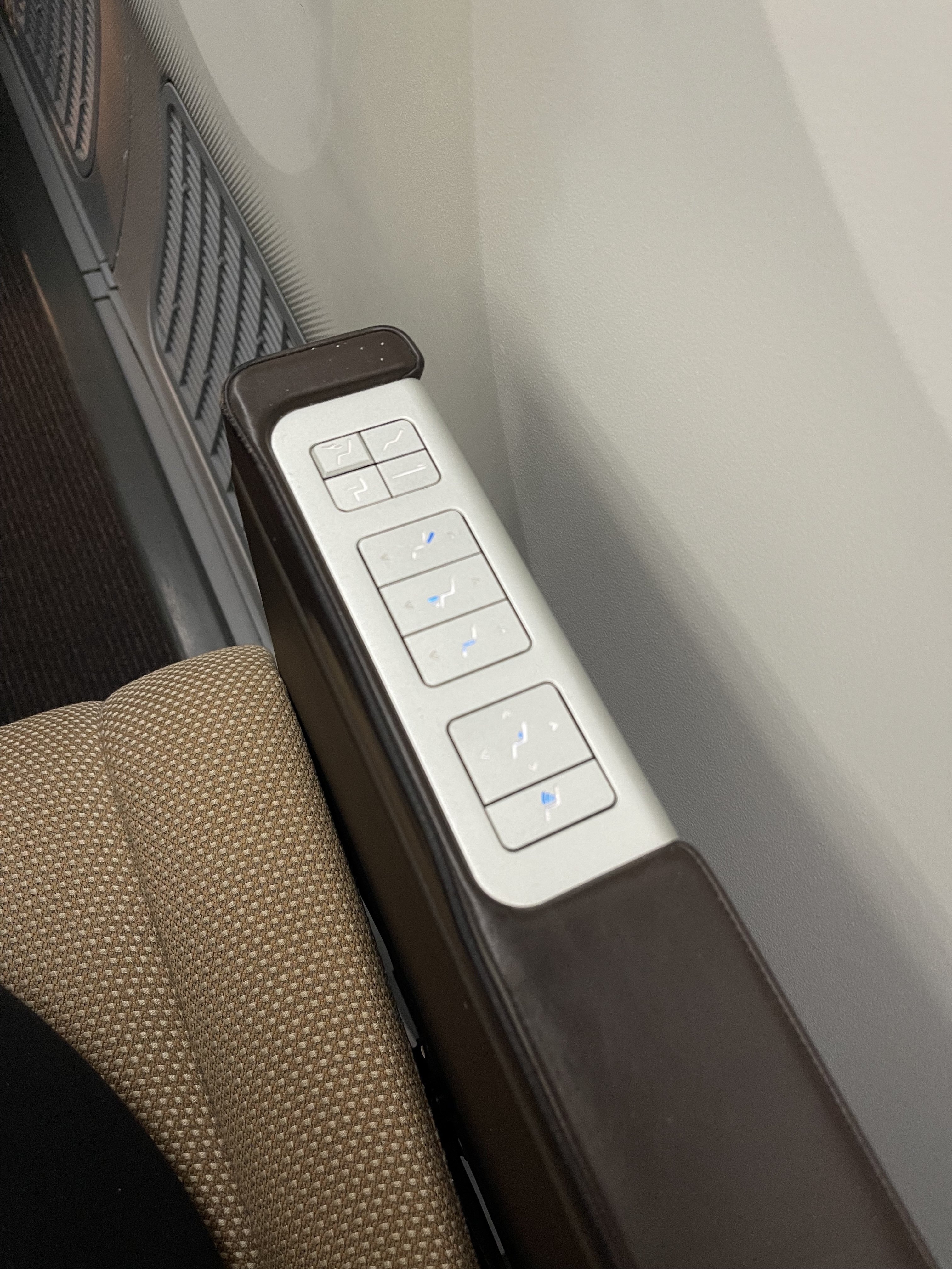 Tucked to the left of our seat was the entertainment control, charging ports, a hook for headphones and a reading light. To the right were our seat controls for changing the position from upright to a fully flat bed. Under our footrest in front was a large space for storing our bag. This was something we really valued, as some Business Class seats do not offer a large enough space to store a bag under the seat in front of you.