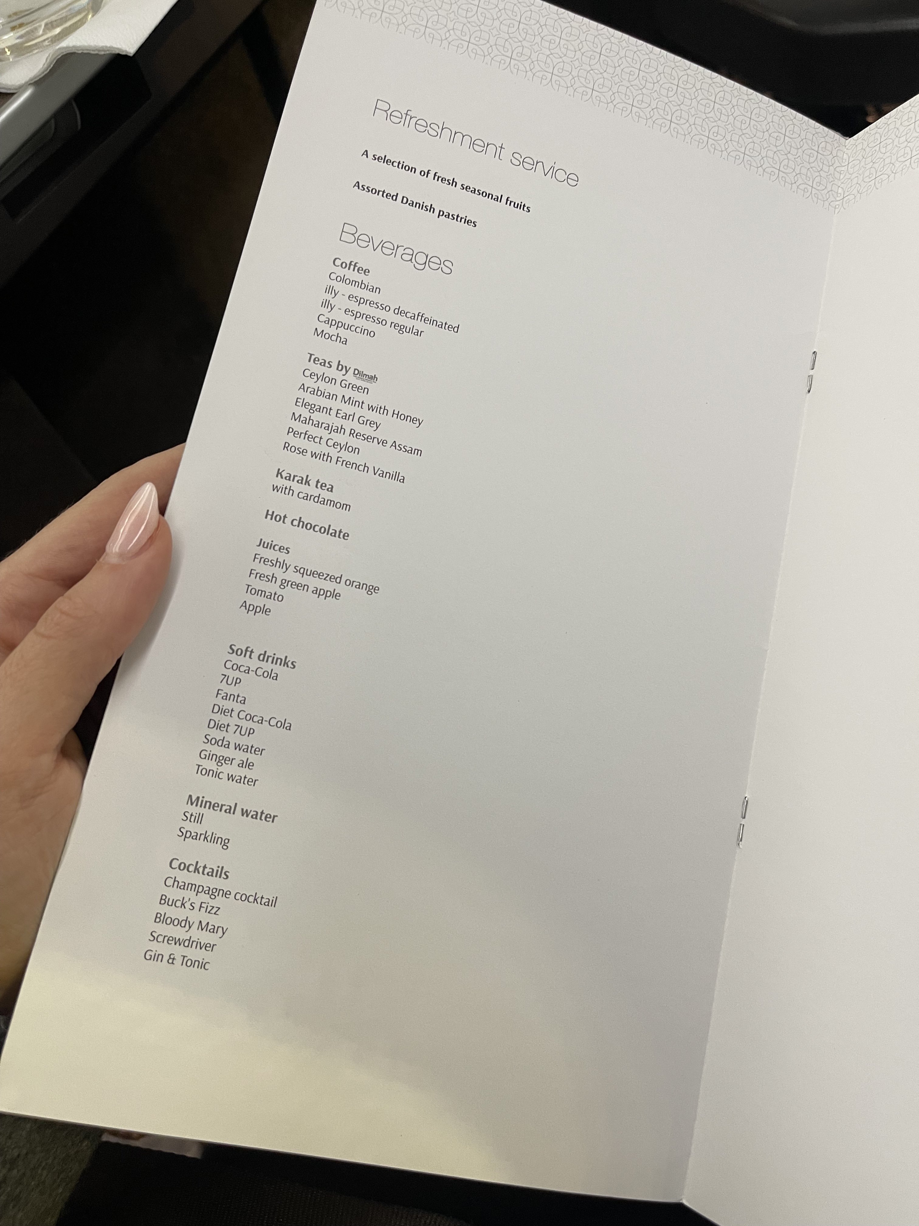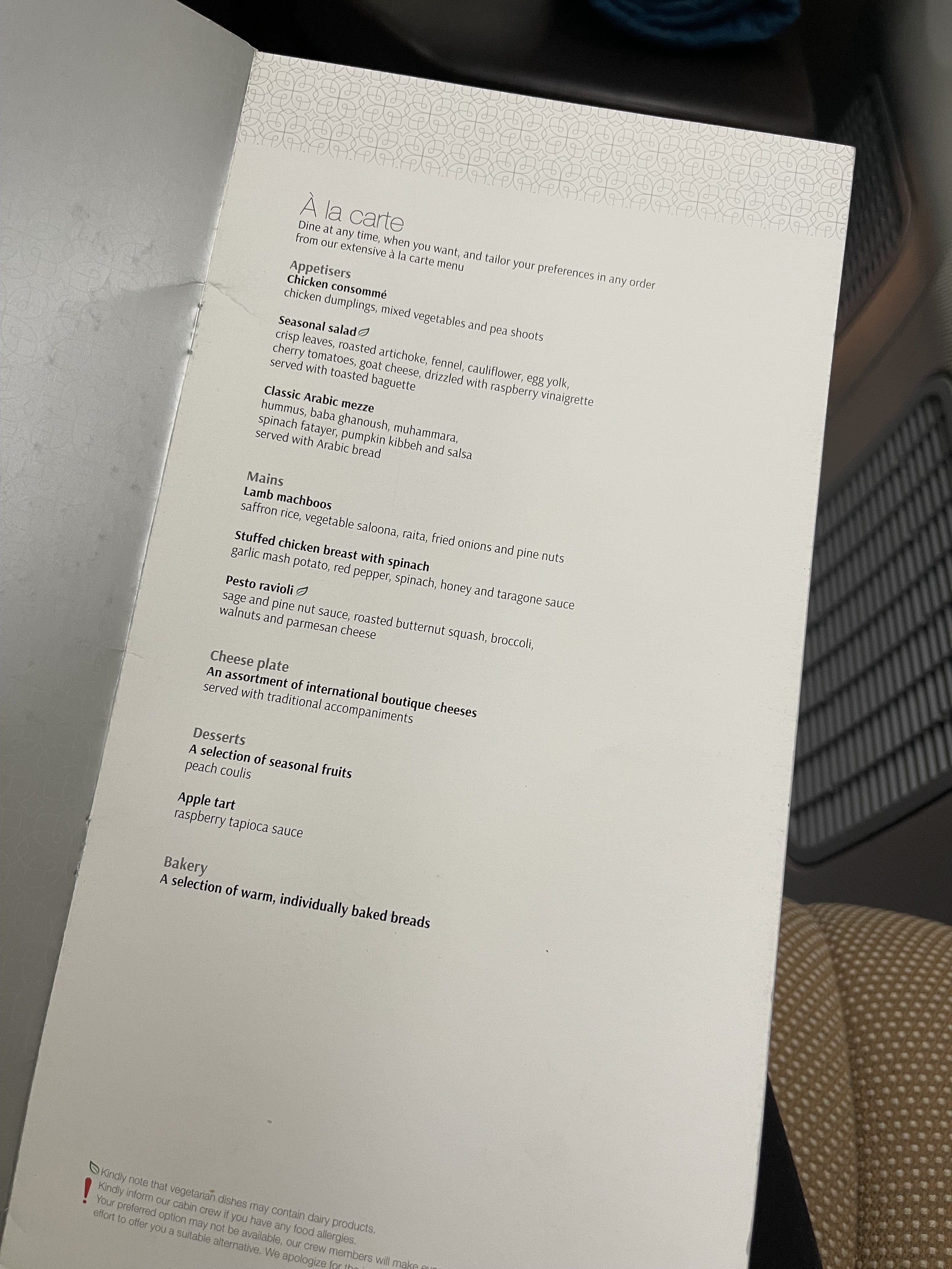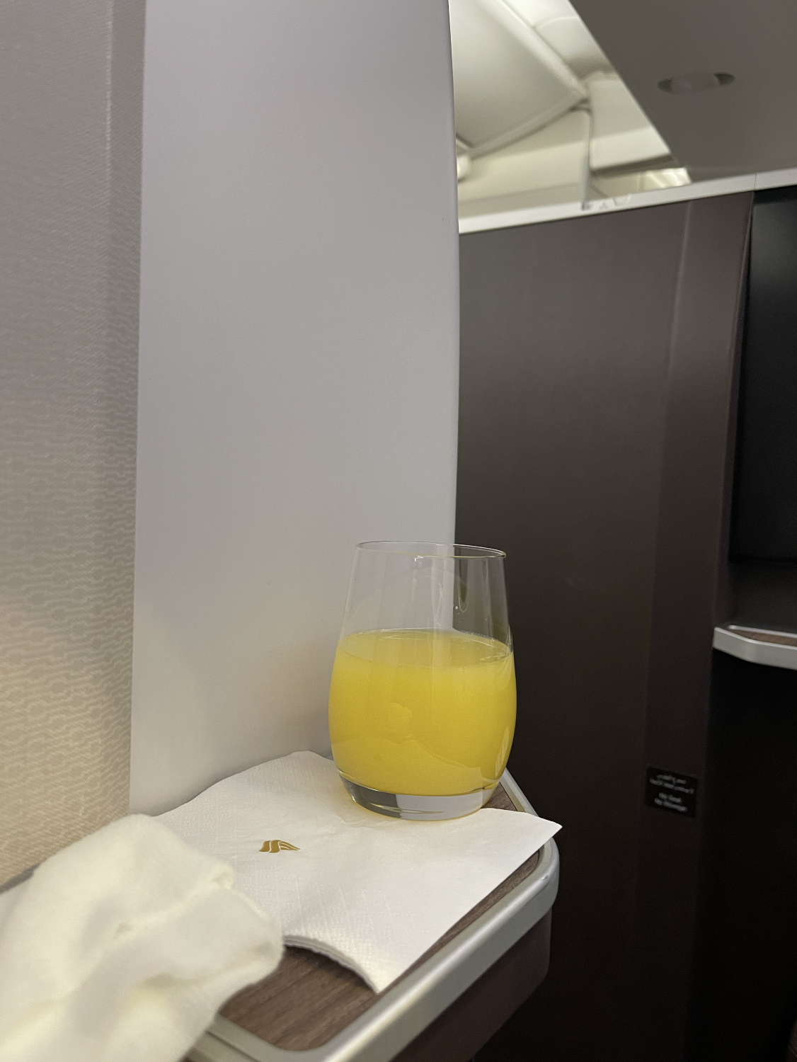 Due to departing Paris at 9:10pm, we were served a dinner service. A a la carte menu was provided shortly after boarding, along with a warm towel to clean our hands and a choice of freshly squeezed apple or orange juice. We opted for the orange juice and also selected to receive our meal straight away in order to then be able to get a few hours of sleep.